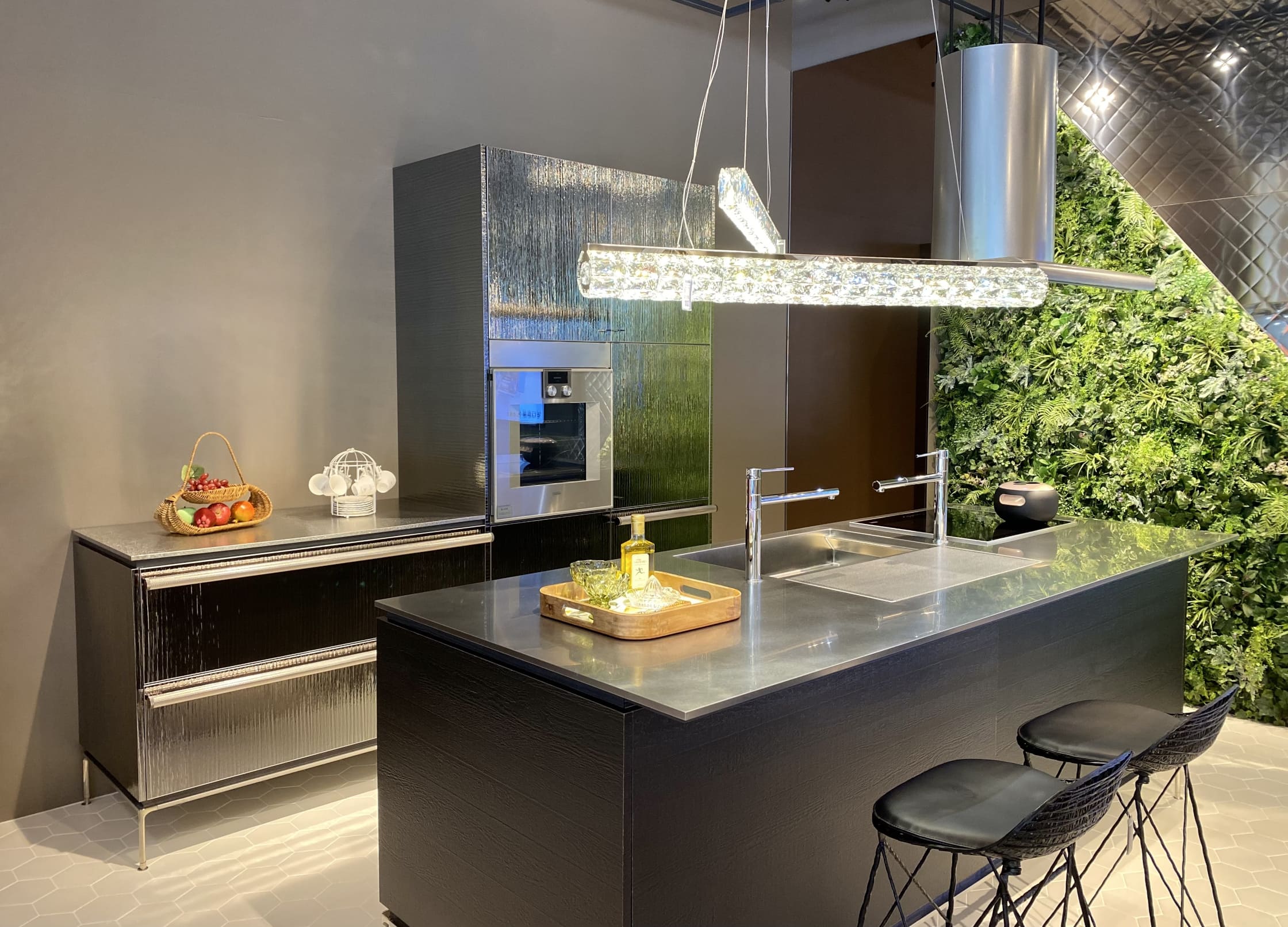また、キッチンの扉柄である、木を燻したような風合いを持つ「スモーク」と、カウンターに並ぶスツールの素材でもあるカーボン(炭)との相性は抜群です。