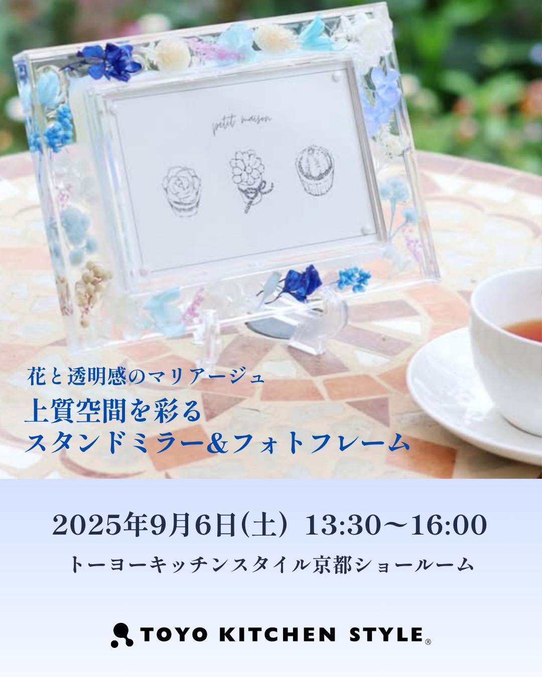 京都ショールームでは講師に中丸摂子氏をお迎えし、「上質空間を彩るスタンドミラー&フォトフレーム」ワークショップを開催します。