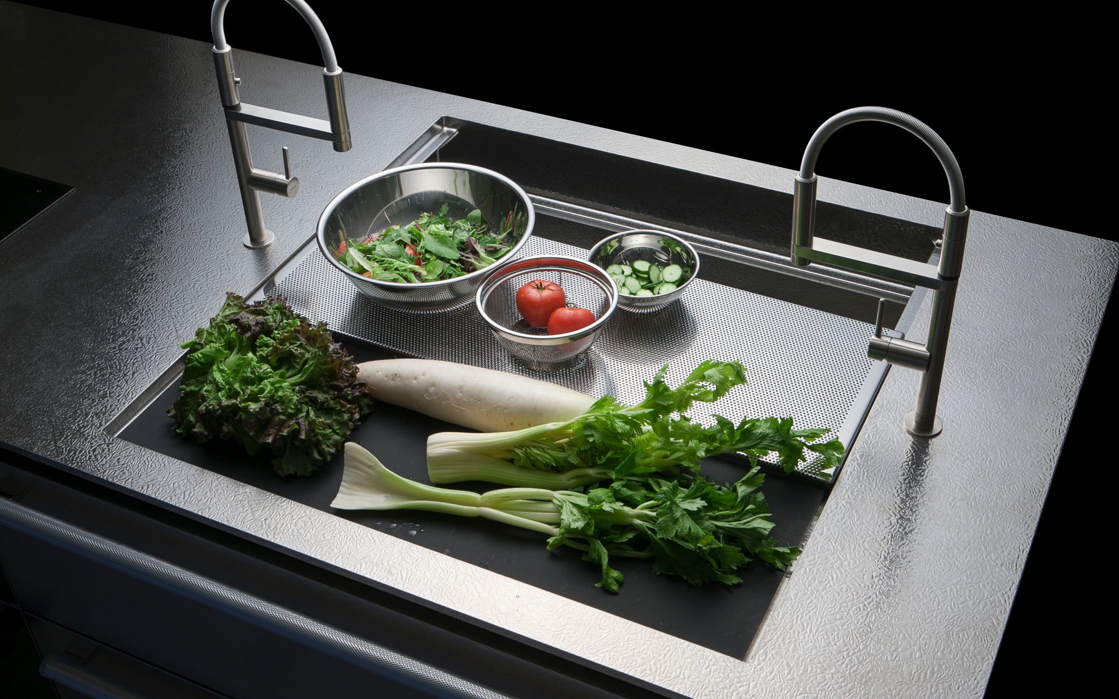 *パラレロシンク:「洗う」「切る」「盛付け」の調理作業がシンクの中で完結する画期的なシンクです。調理台とシンクを一体化することで、シンクの前から一歩も動かずに調理ができる究極の「ゼロ動線」へと導きます。