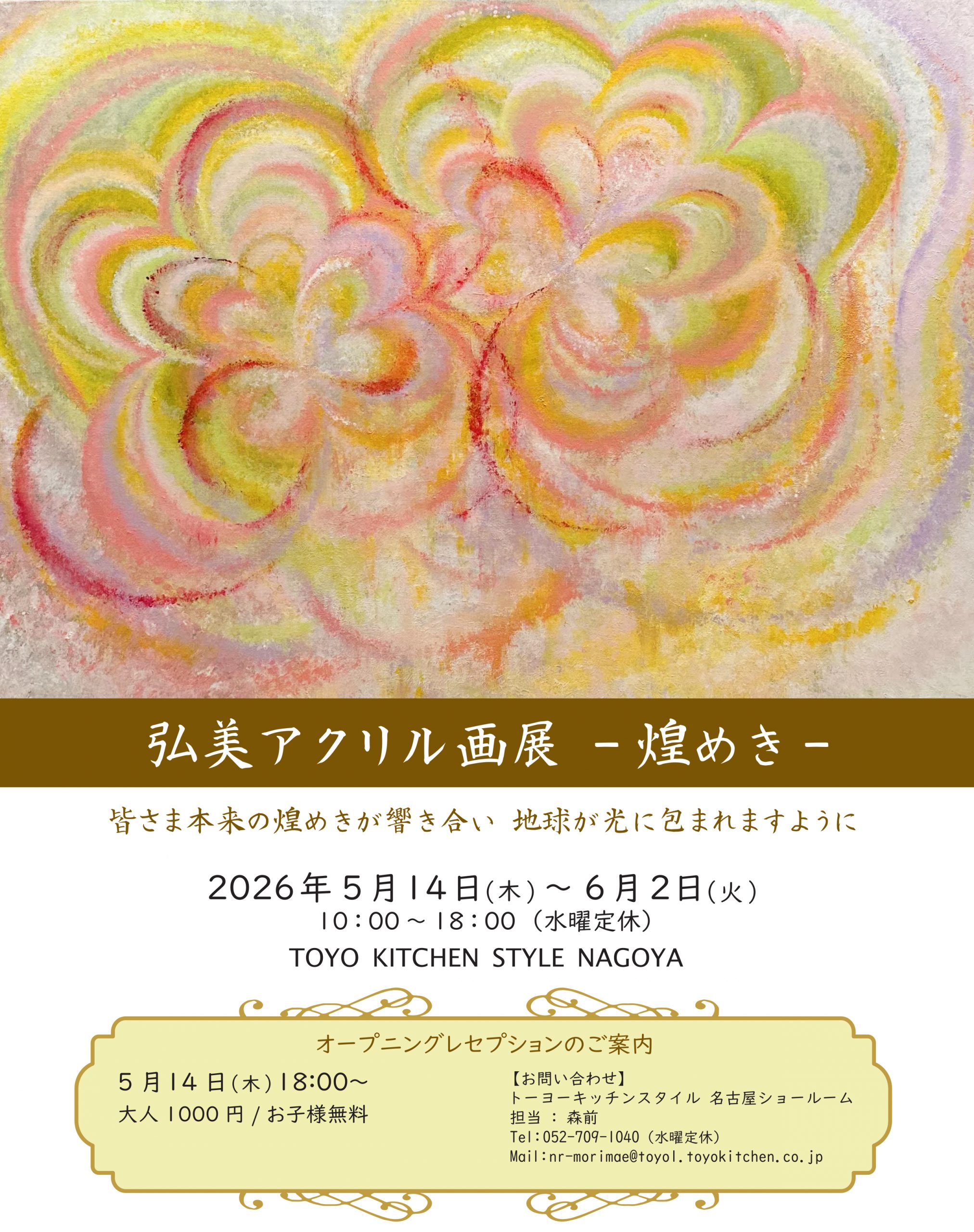 名古屋ショールームにて画家、弘美さんの個展「弘美アクリル画展ー煌めきー」を開催します。 日時:2026年5月14日(木)~6月2日(火) 10:00~18:00 水曜定休 場所:トーヨーキッチンスタイル名古屋ショールーム 名古屋市名東区一社2-21 初日にはレセプションを開催します。 オープニングレセプション 日時:2026年5月14日(木)18:00~ 参加費:大人 1,000円 /お子様無料 ※参加費は当日承ります オープニングレセプションに参加ご希望の方は下記フォームよりご予約をお願いいたします。 ご予約フォーム