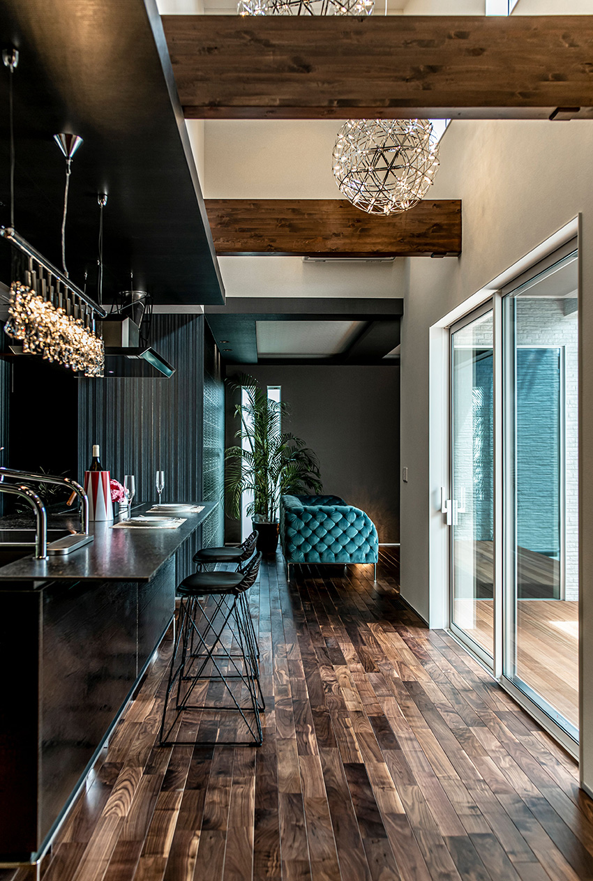 無機質でスタイリッシュなキッチンと、室内の無垢材フロア・天井の自然素材との組み合わせに少し悩みましたが、雰囲気の合う材種や色合いを組み合わるようにしました。