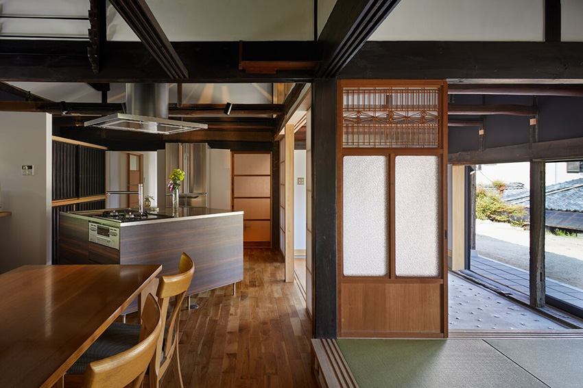 古民家空間の特徴である開放的な柱割りによるグリット空間からキッチンの配置をずらす事で作業性や家事時の視覚効果を工夫しています。