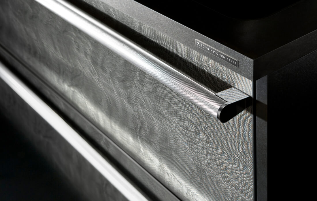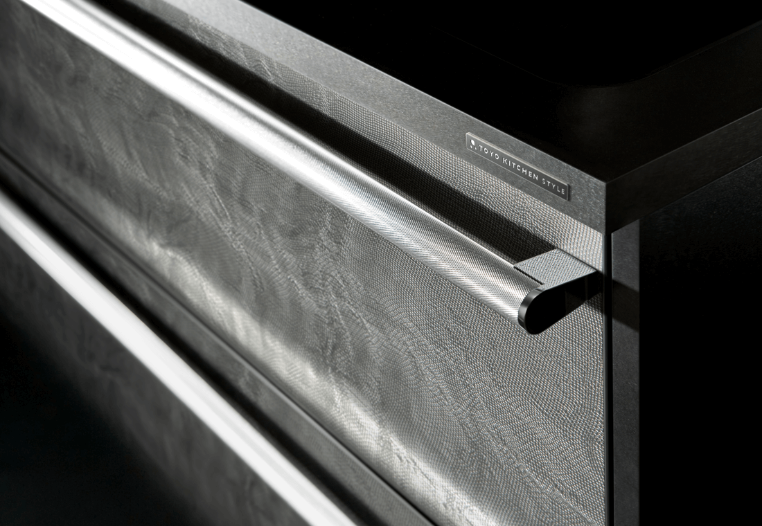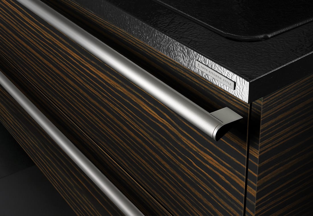 ステンレスは錆びつきや汚れもつきにくく衛生的、かつ金属のもつ剛性は過酷なキッチン環境に最適。熱にも強く、衝撃に対する弾力性も兼ね備え、再生可能なサスティナブルな素材です。さらにトーヨーキッチンスタイルでは高品質なSUS304を標準採用。成形や加工が難しいとされるこの素材を、創業以来培ってきた職人の技術で美しく丁寧に仕上げています。