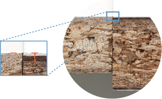 一般的なキッチンよりも厚い18mmのパーティクルボードはチップも高密(右)。表面の化粧層の厚さも一目瞭然です。