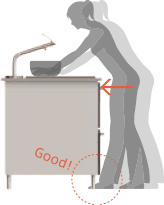 調理作業は立ち仕事。包丁などを扱う際は、やや前傾姿勢になり、思った以上に疲労を伴うことがあります。エアフローにより足元に空間が生まれ、つま先が入ることで、作業がもっとラクになります。