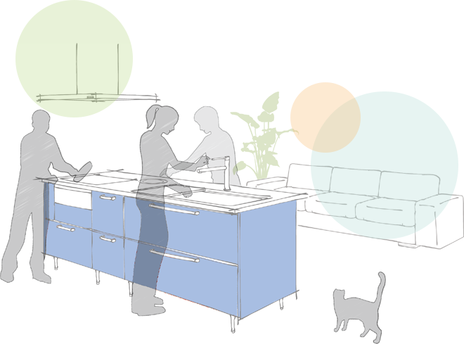 • キッチンは専門業者の手による設備工事が必要です。当社取付施工オプションをご購入頂くか、最寄りの施工業者等にご相談ください。