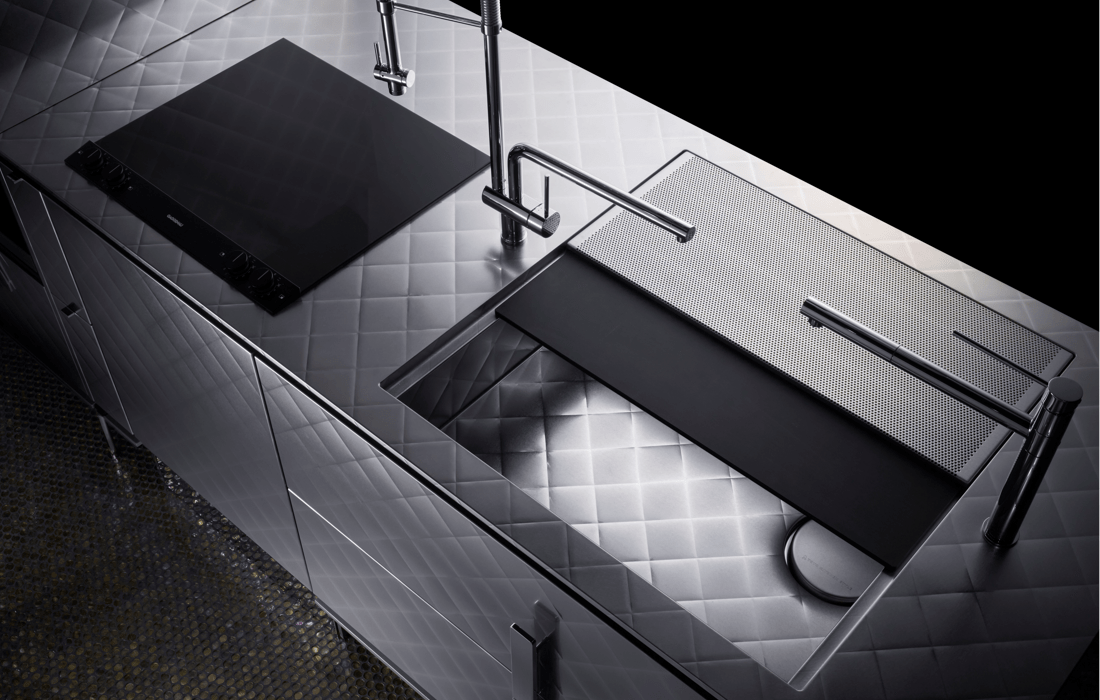 パラレロに、上質な質感の「キルトマット」デザインが新登場。象徴的なキルティングをステンレスに立体的に表現し、シンク内側にも贅沢に採用。美しさと手触りに加え、傷やくもりが目立ちにくいマット加工も魅力です。洗う・切る・盛り付けまでをシンク内で完結できる“ゼロ動線”設計。