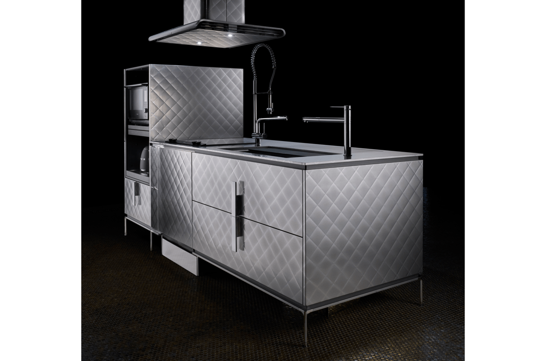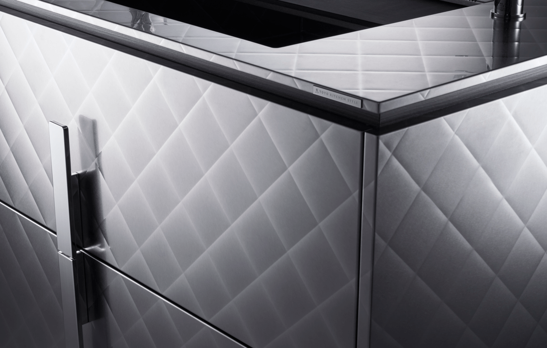硬いステンレスを柔らかなキルティングに仕立てたアイコニックなステンレスデザイン「キルト」。職人の匠の技によりマットに生まれ変わり、上品で柔らかな輝きを纏いました。マット加工により、キッチン作業での傷やくもりが目立ちにくくなり、さらりとしたシルクのような手触りはキッチンに立つ時間を特別にします。