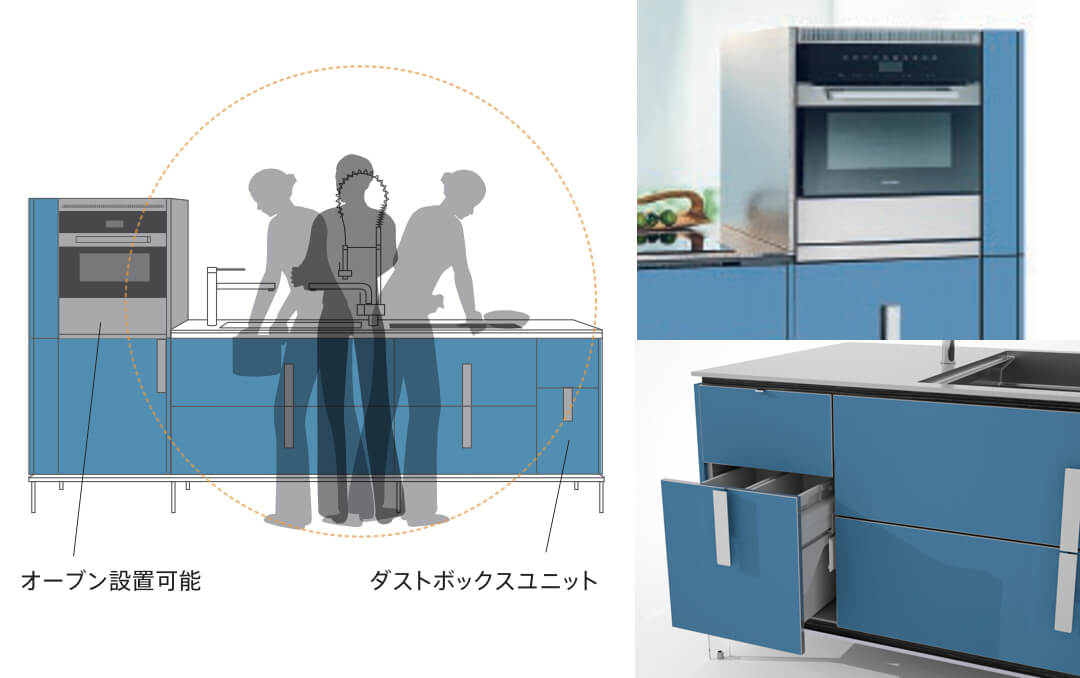 ダイニング側に食洗機をビルトインできる収納ブロックが登場。ダイニングから手の届く範囲に食洗機を設置することが可能になりました。使った食器は、テーブルからそのままシンク、食洗機へ。後片付けもゼロ動線で、家事の負担が軽減します。