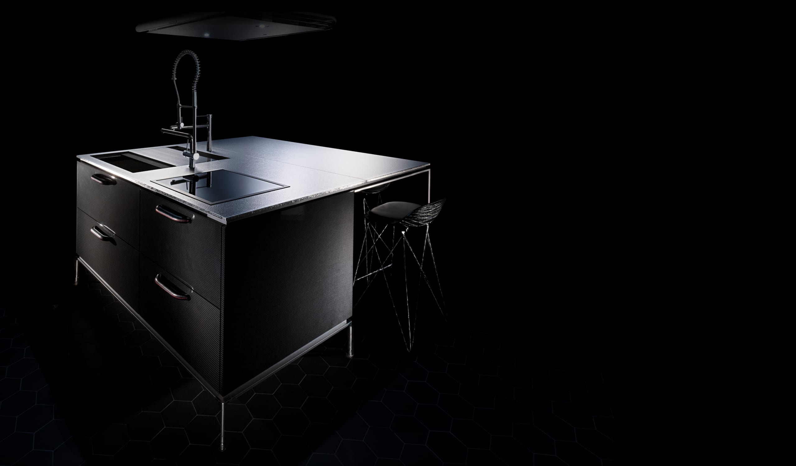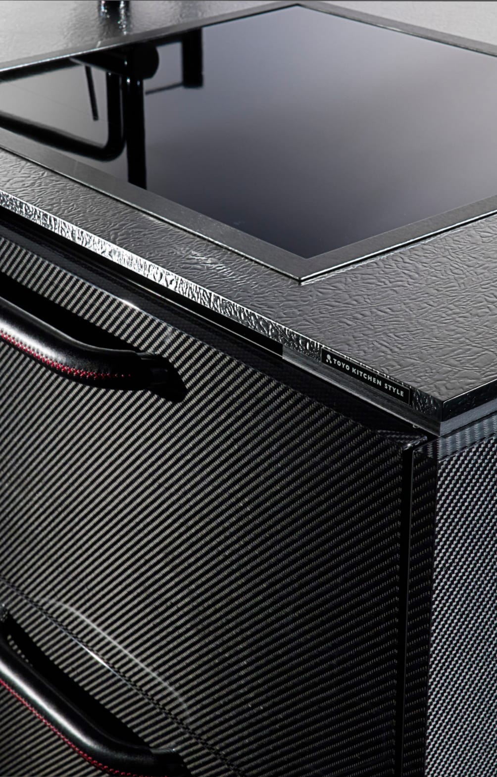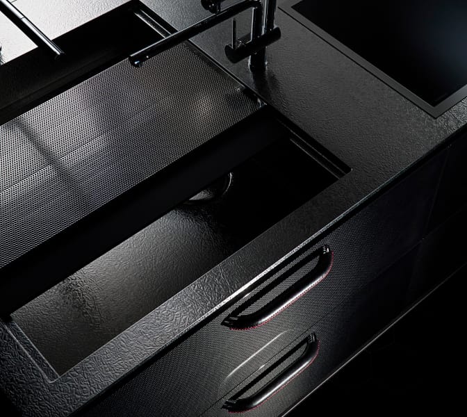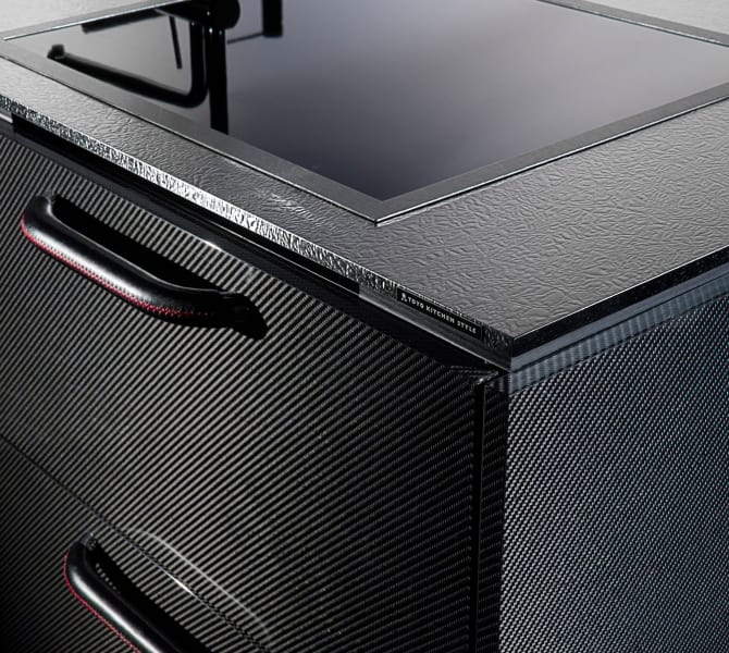 先端素材「カーボンファイバー」は、鉄以上の強さを持ち、アルミよりも軽量。強靭で耐久性が高く、洗練された印象を与えます。遠目にはマニッシュな漆黒のキッチンに見えますが、近づくと細やかな繊維の表情が浮かび上がるのも魅力。美しさを強調するため、幾重にも重ねたピアノ塗装を施しました。