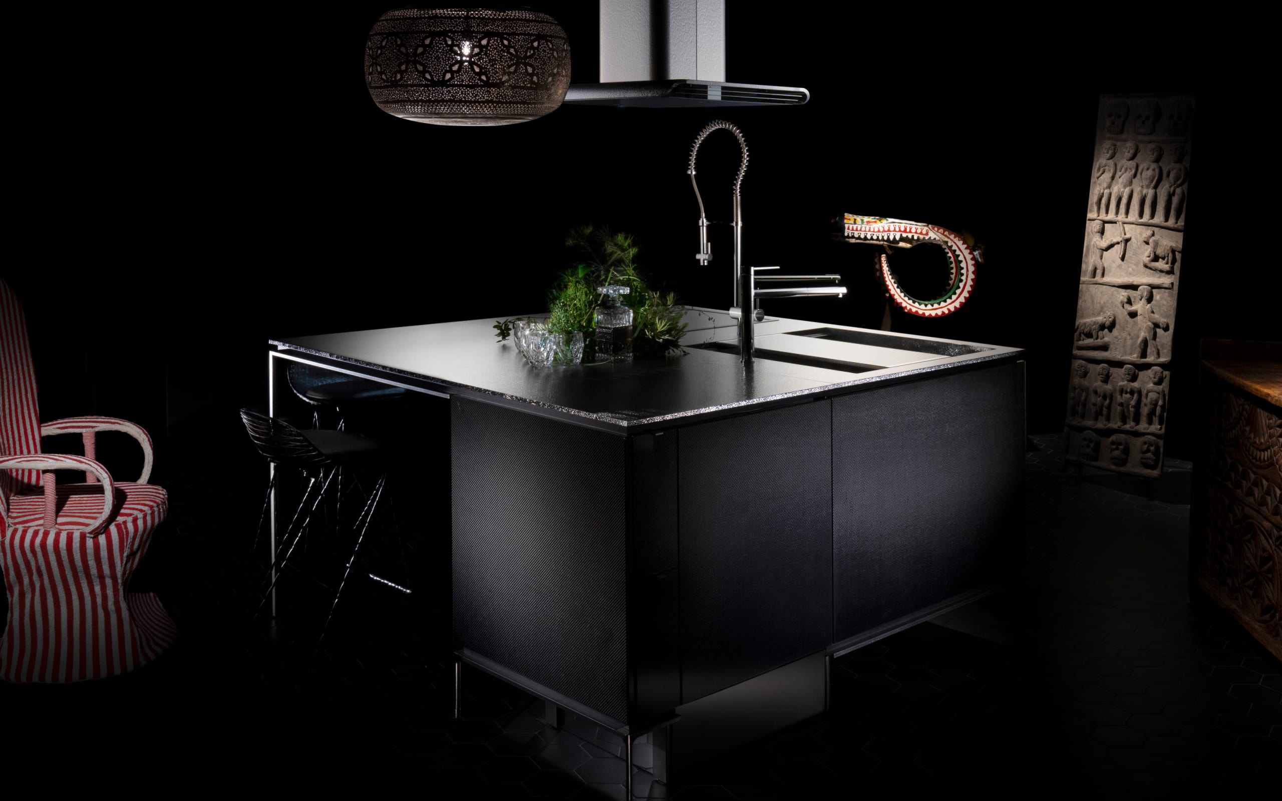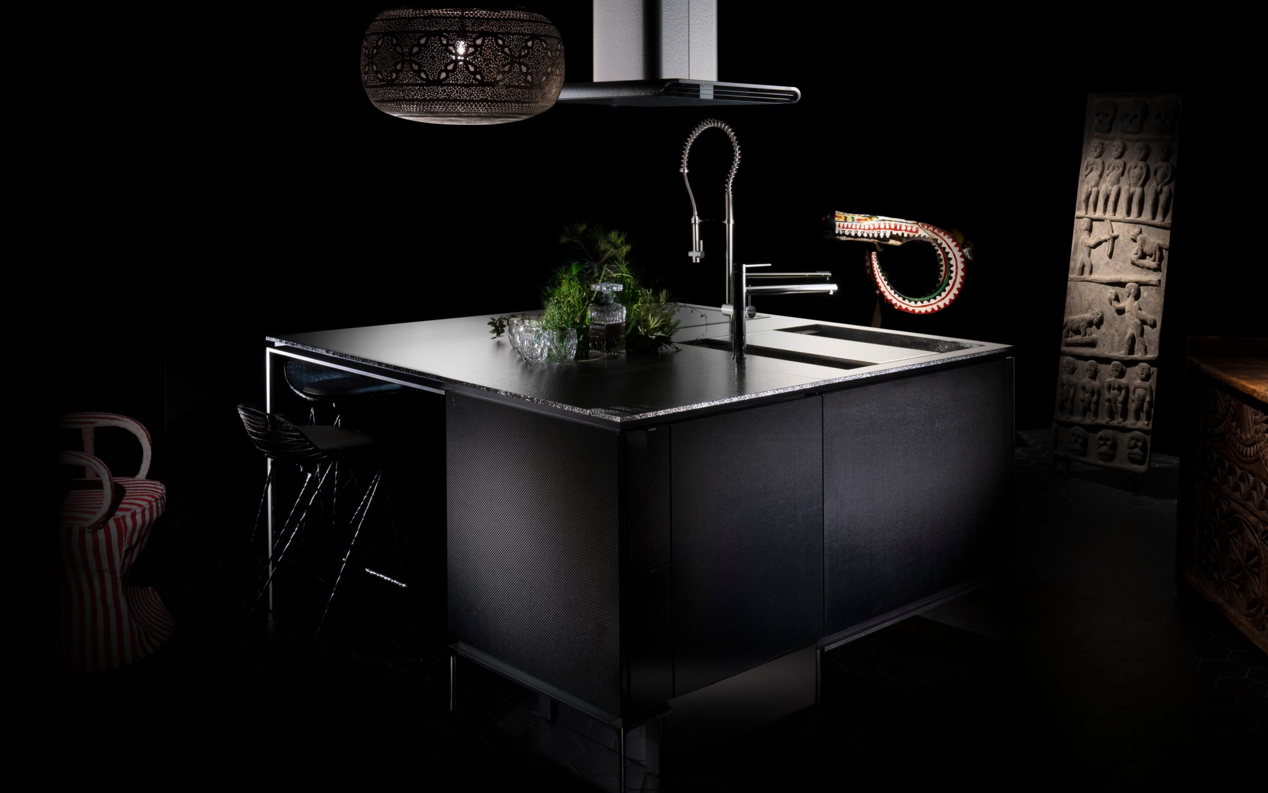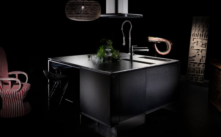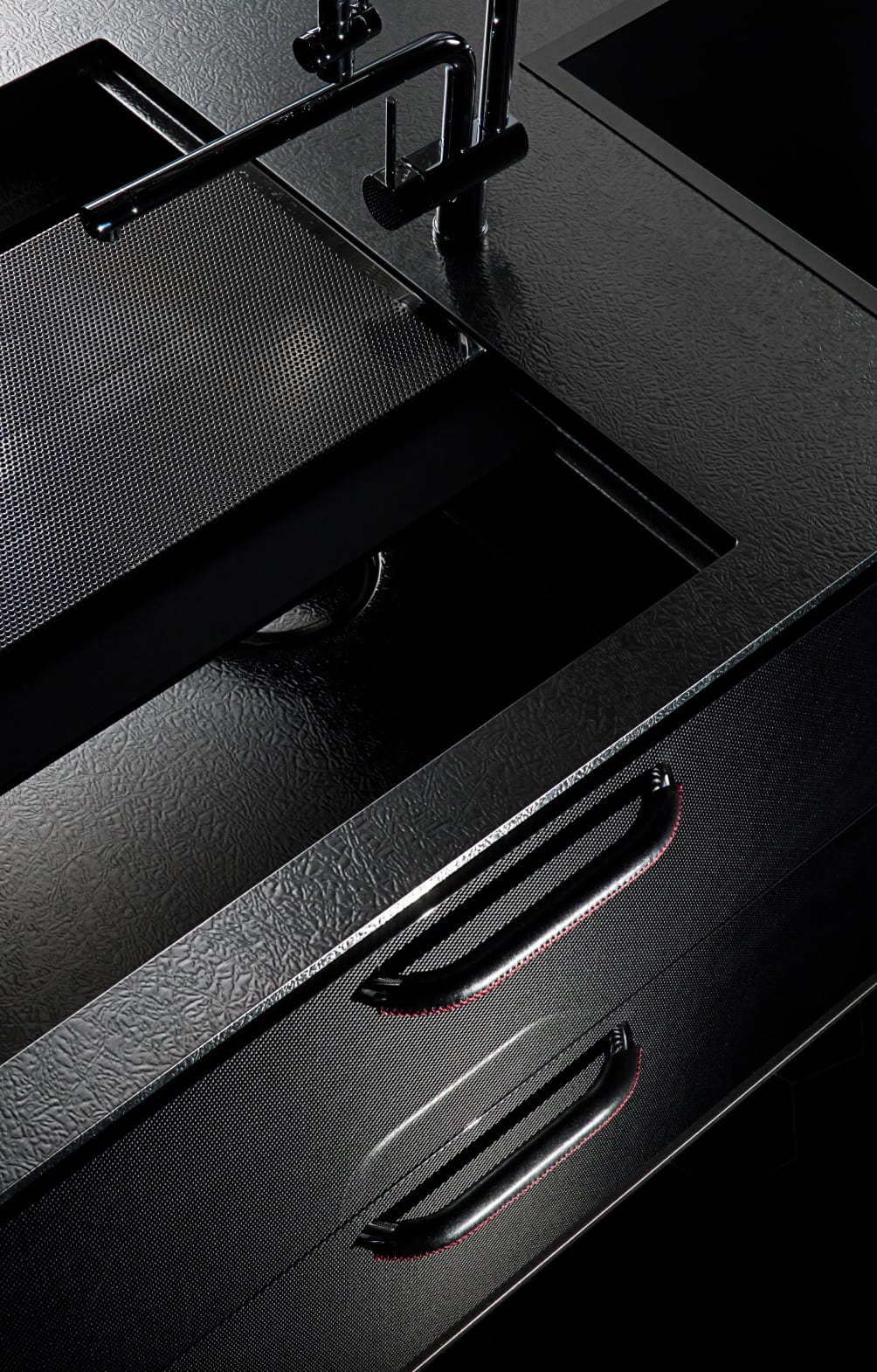 先端素材「カーボンファイバー」は、鉄以上の強さを持ち、アルミよりも軽量。強靭で耐久性が高く、洗練された印象を与えます。遠目にはマニッシュな漆黒のキッチンに見えますが、近づくと細やかな繊維の表情が浮かび上がるのも魅力。美しさを強調するため、幾重にも重ねたピアノ塗装を施しました。