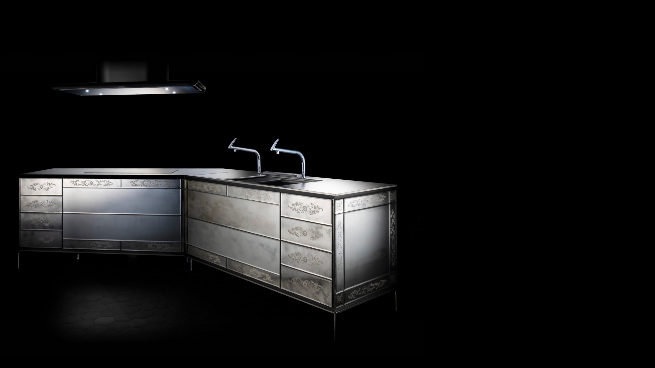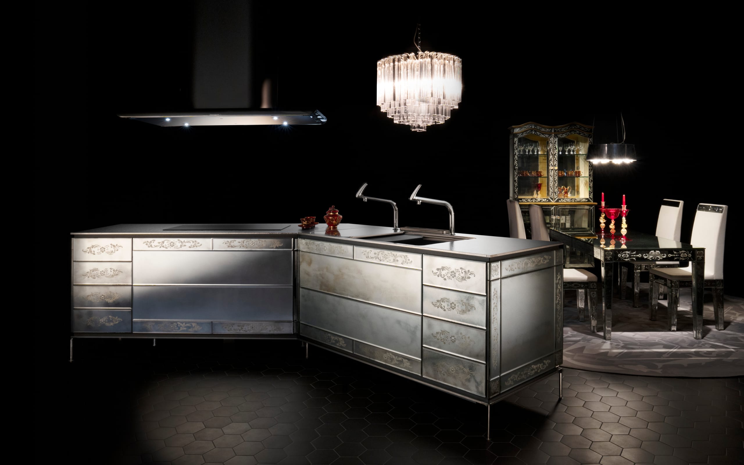 アートとしても評価されるヴェネツィアンミラーを贅沢に使用したキッチン。13世紀から受け継がれるクラシカルなマテリアルを、モダンなエレガンスへと昇華しました。