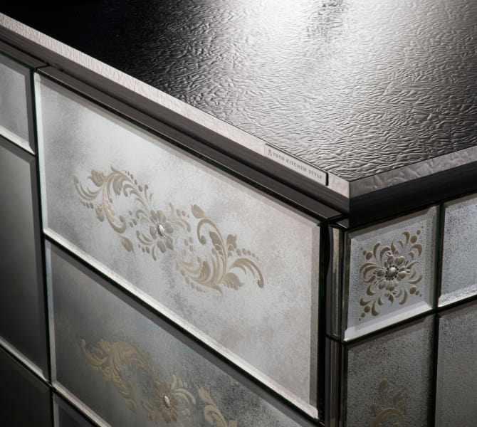 キッチン全面を覆うのは、ヴェネツィアのガラス工房で製作された鏡です。13世紀から守られてきた伝統的な技法で製作されたヴェネツィアンミラーは、歴史的価値を持ち、独特の美しさと豪華さが特徴です。手作業で精密な彫刻や装飾を施すことで、鏡自体が一つの芸術作品としての存在感を持つように仕上げています。