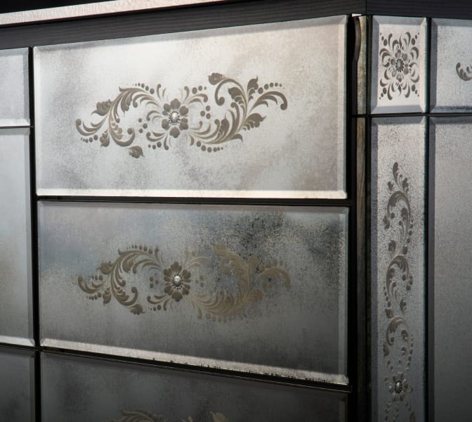 熟練した職人のエングレービング技法により、手作業で美しいクラシックフローラル文様が施されています。鏡の周囲は斜めにカットされることで輝きを放ち、立体的な表情を生み出します。銀面処理は本物のシルバーを手作業で蒸着し、全体に施したアンティーク加工と相まって、優しく深みある映りこみを実現しました。