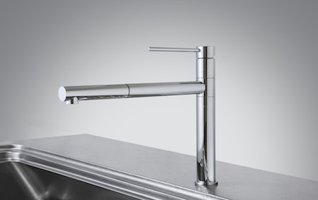 トーヨーキッチンスタイルの広く深いシンク全体をカバーできるよう開発された、33cmものロングスパウトを持つあたらしい水栓。