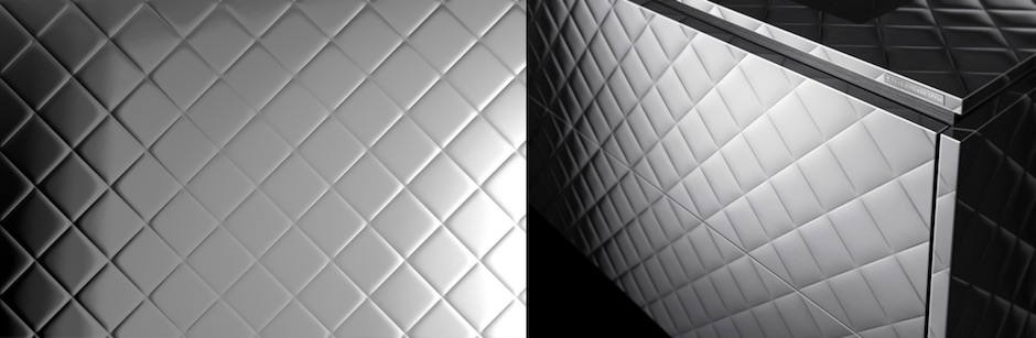 ミシンで固いステンレスを縫ったような、特殊プレス技術でダイヤパターンの幾何学模様を描き、キルトダウンに羽毛をいれるように立体的にステンレスを浮かびあがらせています。