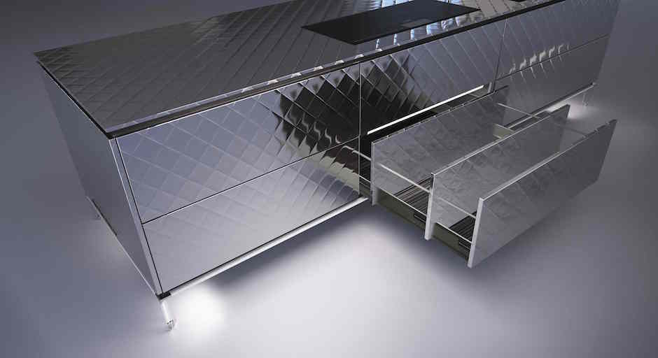 ワークトップやキッチン扉が、ステンレスのキルトで 1 つになりました。
