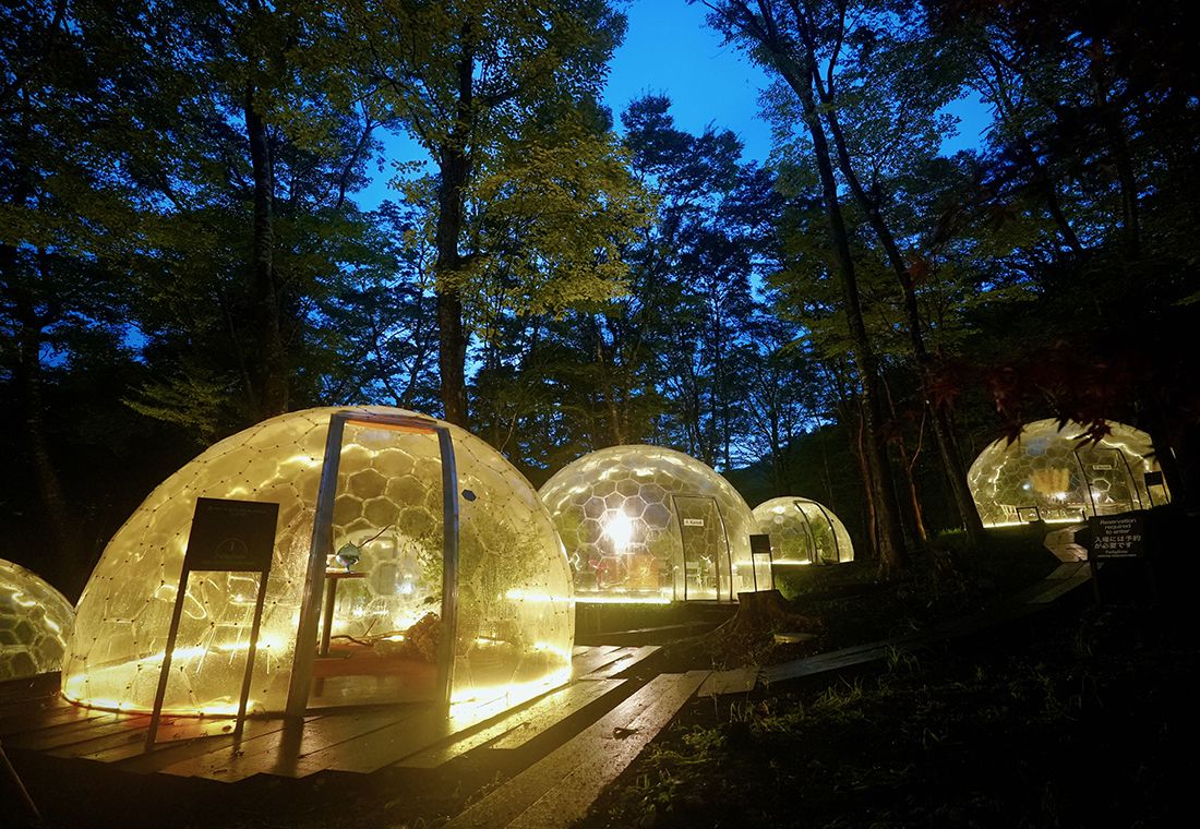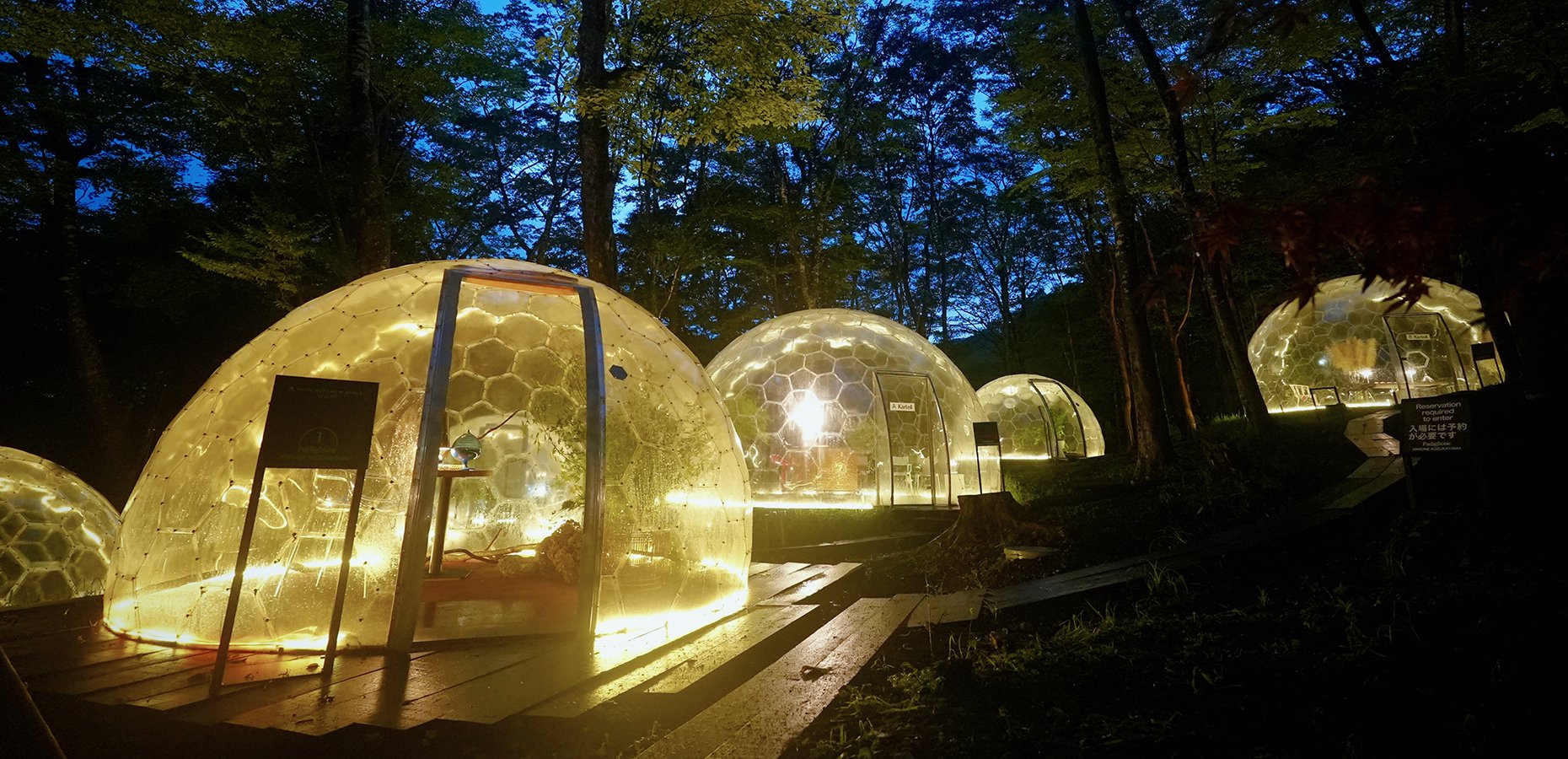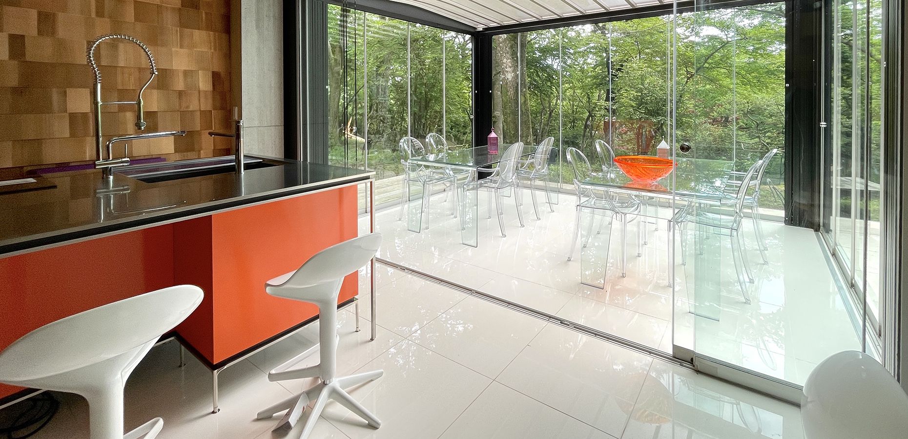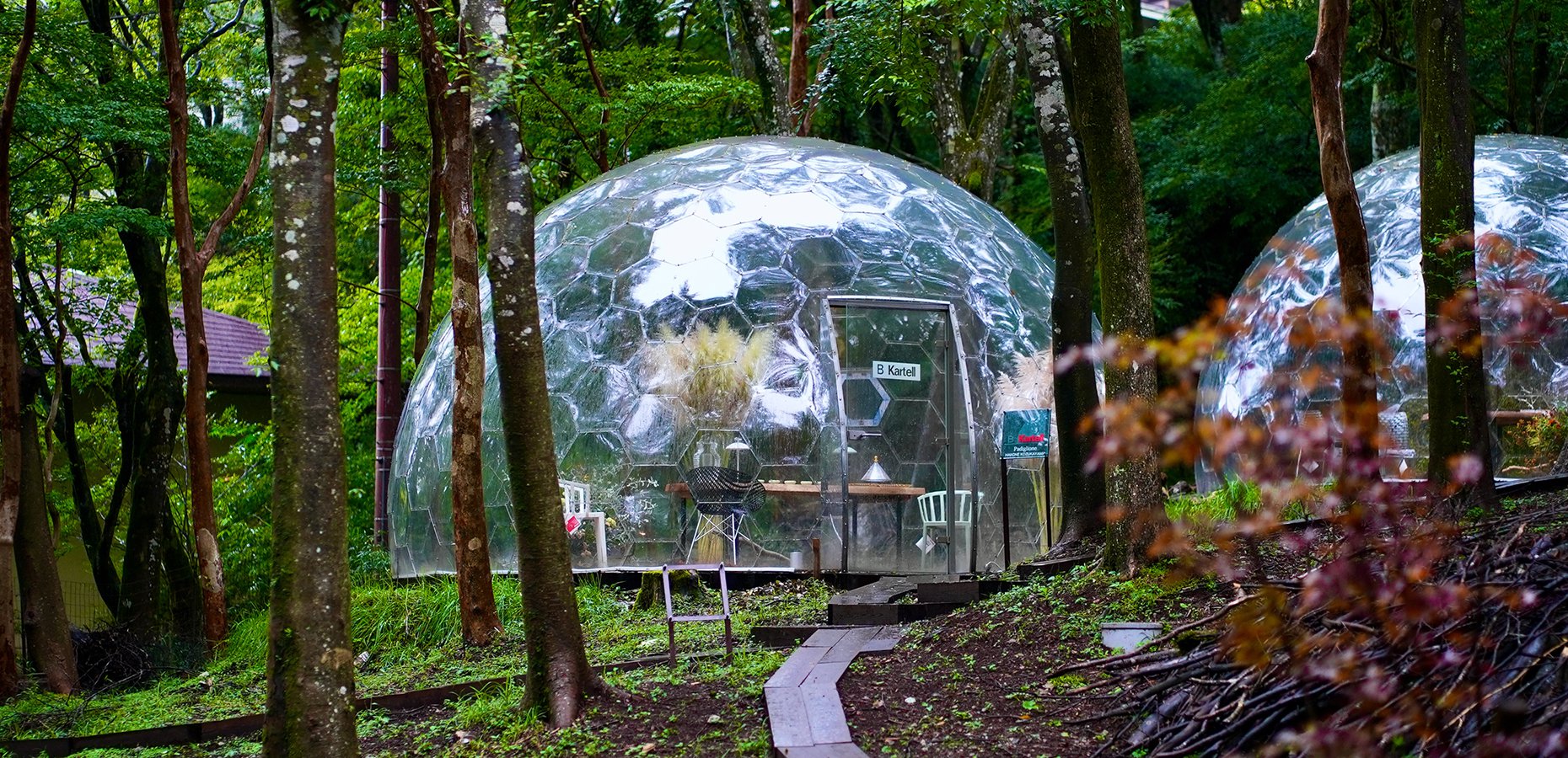 INO Q-LAND(パッションオレンジ)のキッチンの展示から、集(つどい)ソファ、Kartell|カルテルやmoooi|モーイのインテリアなど、深い森に囲まれた箱根国立公園内で、幻想的なドームを用いて個性溢れるキッチンとインテリアの空間をご堪能いただけます。