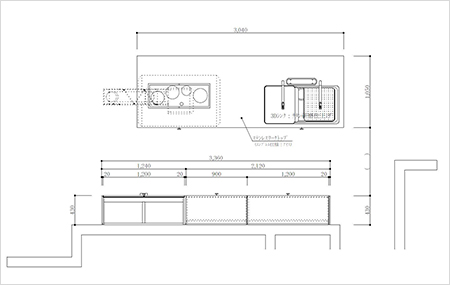 キッチンは、アイランドキッチンと背面にカウンター収納・収納ユニットを並列に配置したレイアウトです。