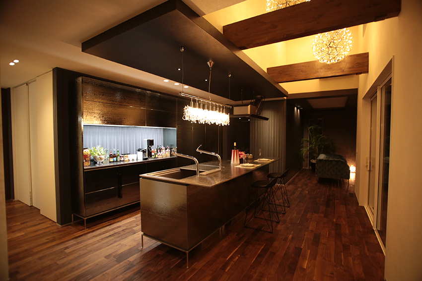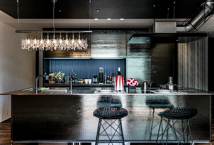 キッチンの扉は薫製された木とメタリックのハイブリッドな意匠が特徴のメタルスモーク、ワークトップには流氷をイメージするステンレスのアイスTOPに、シンクを立体的にフル活用できる3Dシンクを組み合わせています。