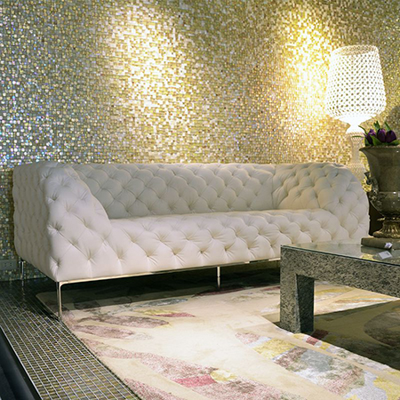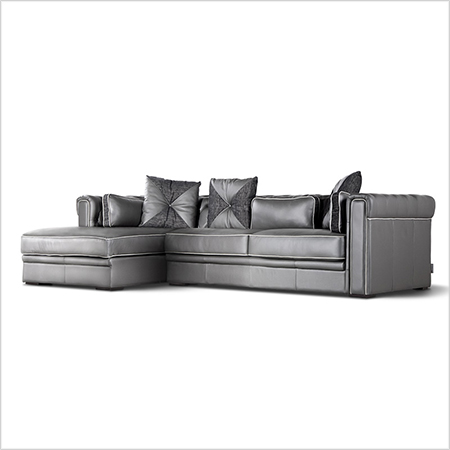肘掛けと背もたれが同じ高さで、かつ低く構えたフォルム、リズミカルにステッチ(タフティング加工)を施したクラシックなチェスターフィールド調のソファを、モダンにアレンジしたデザインです。