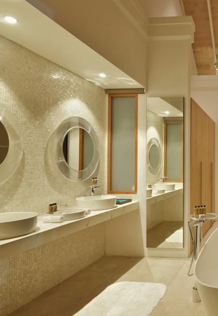 また、直線的なインテリアの中に、ラウンド型のミラーが配置されることで存在感を出し、ゴールドのインテリアの強い存在感と中和させることができます。これによって、ゴールドのインテリアだけが浮いてしまうということがなく、自然な空間へと仕上がります。