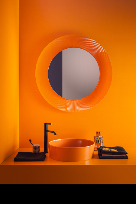 洗面ボウルや洗面台、壁面も同じオレンジに統一することで大胆な空間になりつつもまとまった空間を作ります。さらに、ブラックの水栓や小物を置くことで、空間全体の印象を締めることができます。もちろん、ワンポイントでカラフルなフレームミラーをコーディネートしても遊び心があり、明るい空間を創ることが出来ます。
