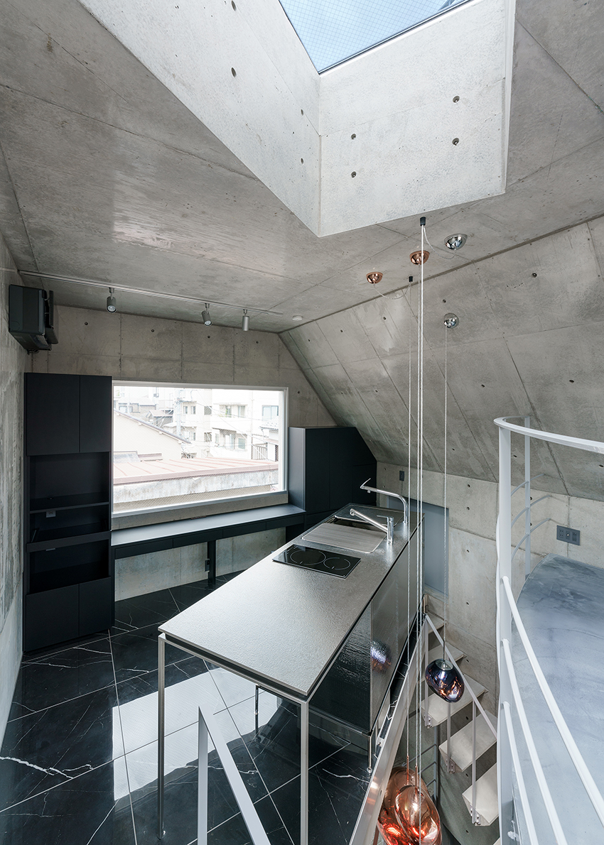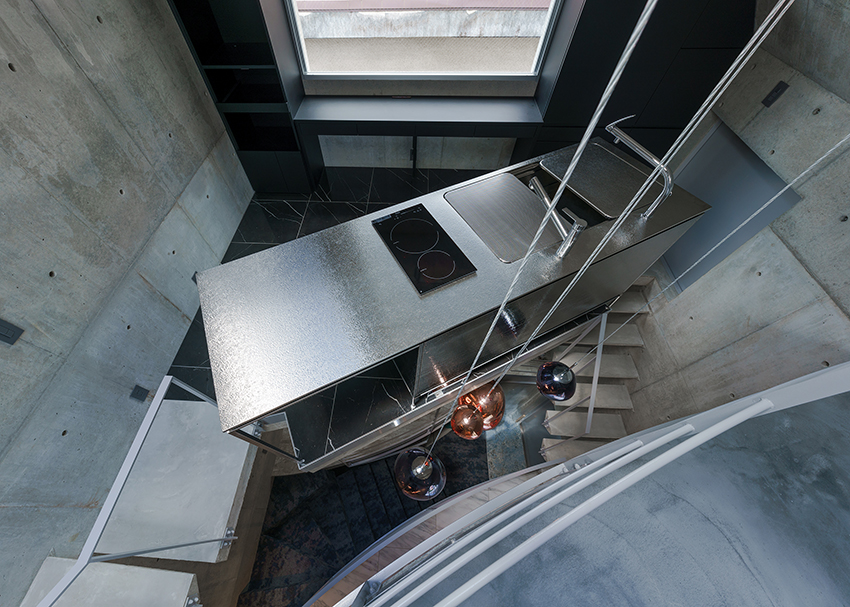 キッチンに合わせてスラブを形成し、吹き抜けに向かって飛び出すようなキッチンスペースになっています。