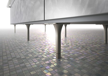 脚で床面からユニットを浮かせることでキッチンが宙に浮く「浮遊感」を実現し、キッチン下に湿気がたまらず、部屋全体の空気を遮らず、空調効率を良くする構造です。