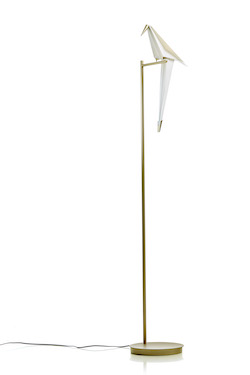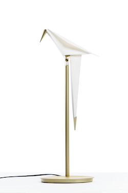 折り紙のように折られた鳥は、くちばしと尾羽根の先端の真鍮色の金属がおもりとなっており、止まり木の上でゆらゆらとバランスを取りながらスイングします。