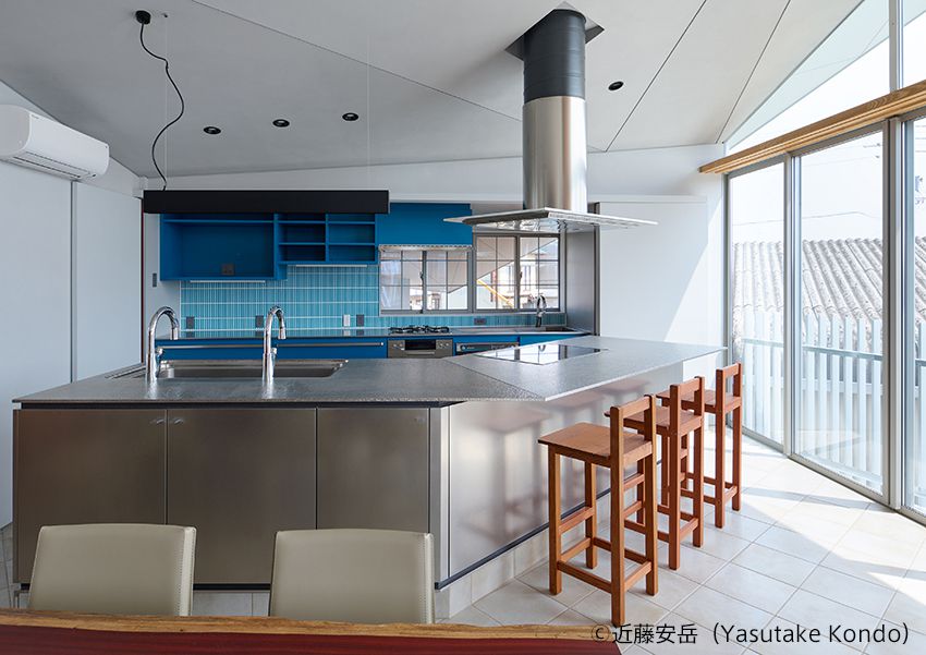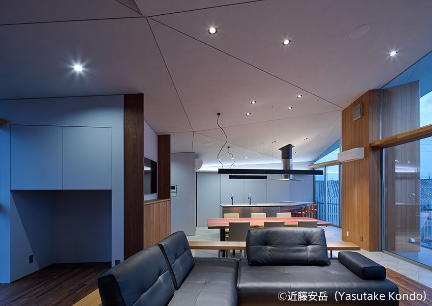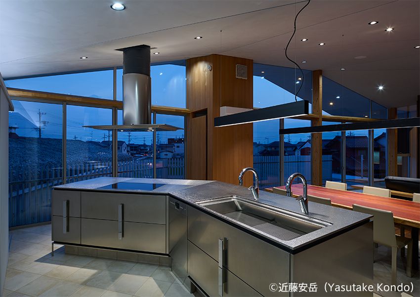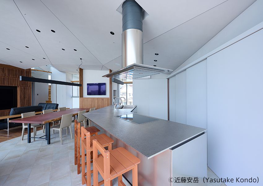 特徴的な勾配天井の空間に設置されたキッチン。
