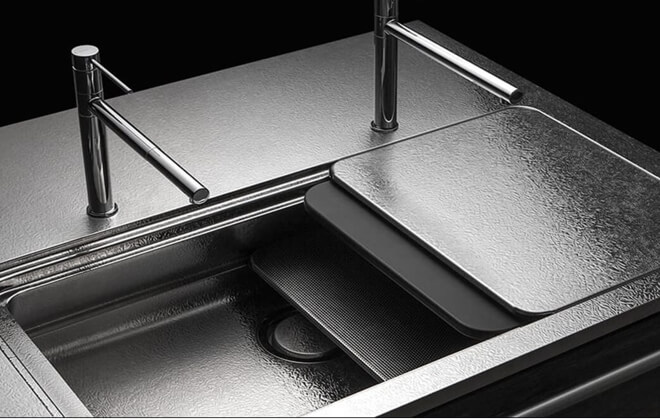 3枚のプレートで立体的な作業を可能にするシンク。野菜を洗う、お肉を切る、盛りつけるなど、加熱調理以外の作業がシンク内で並行して行えます。