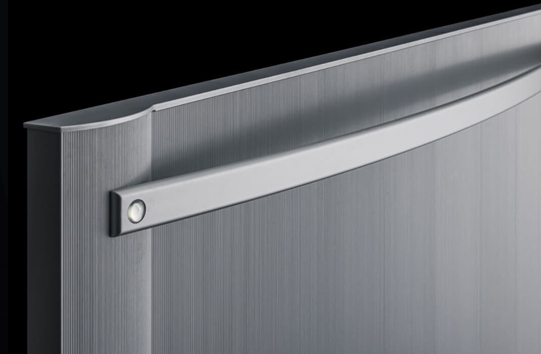 ハンドル付きのアルミ製サイドパネル。縦に入ったスリットがシャープな印象を与えます。