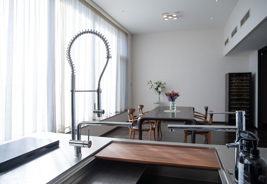 「主人も私もシンプルでモダンなデザインが好きなので、以前からトーヨーキッチンスタイルの製品には憧れがありました。特に『iNO』は愛用しているカッシーナの家具やトムディクソンの照明とも相性がいいのが魅力でした」。