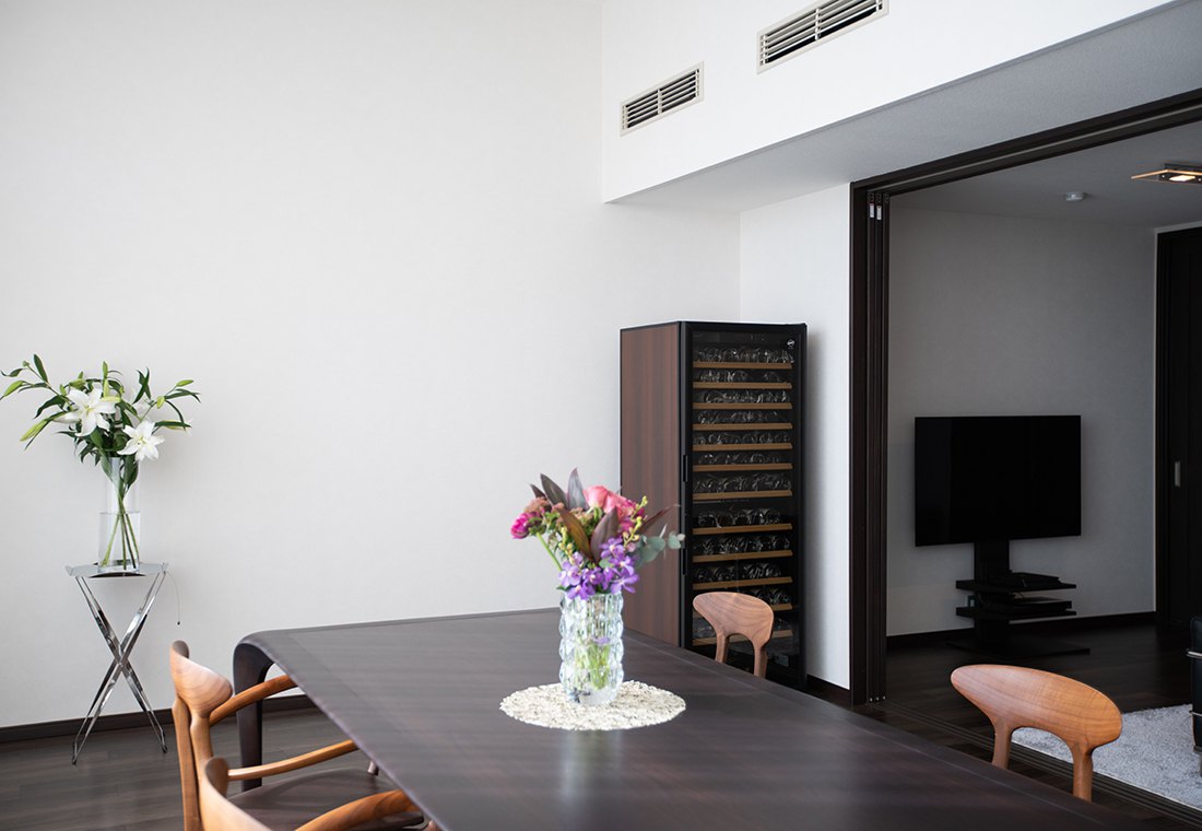 ご夫婦揃ってワイン好きで、リビングの一角に立派なワインセラーのあるK様邸。ワインを飲むのはたいていお店だそうですが、予定のない週末にはご主人がキッチンに立ち、BBQグリルでお肉を焼き、お料理に合わせてご主人が選んだワインを一緒に味わうこともあるのだとか。