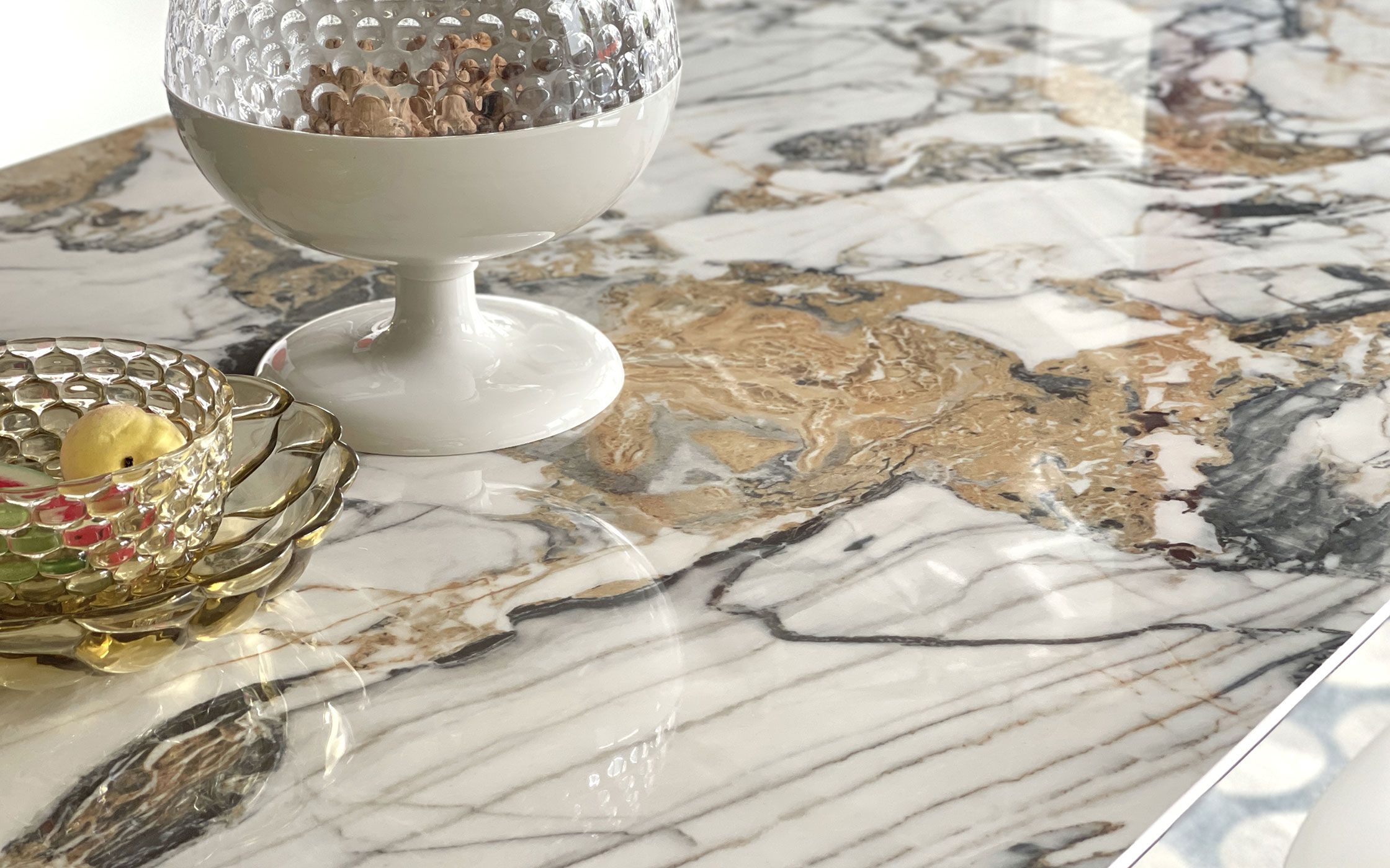 シンフォニー柄のテーブルは食事が並んでいない時にも、華やかなマーブル柄の美しいデザインで空間を華やかにします。