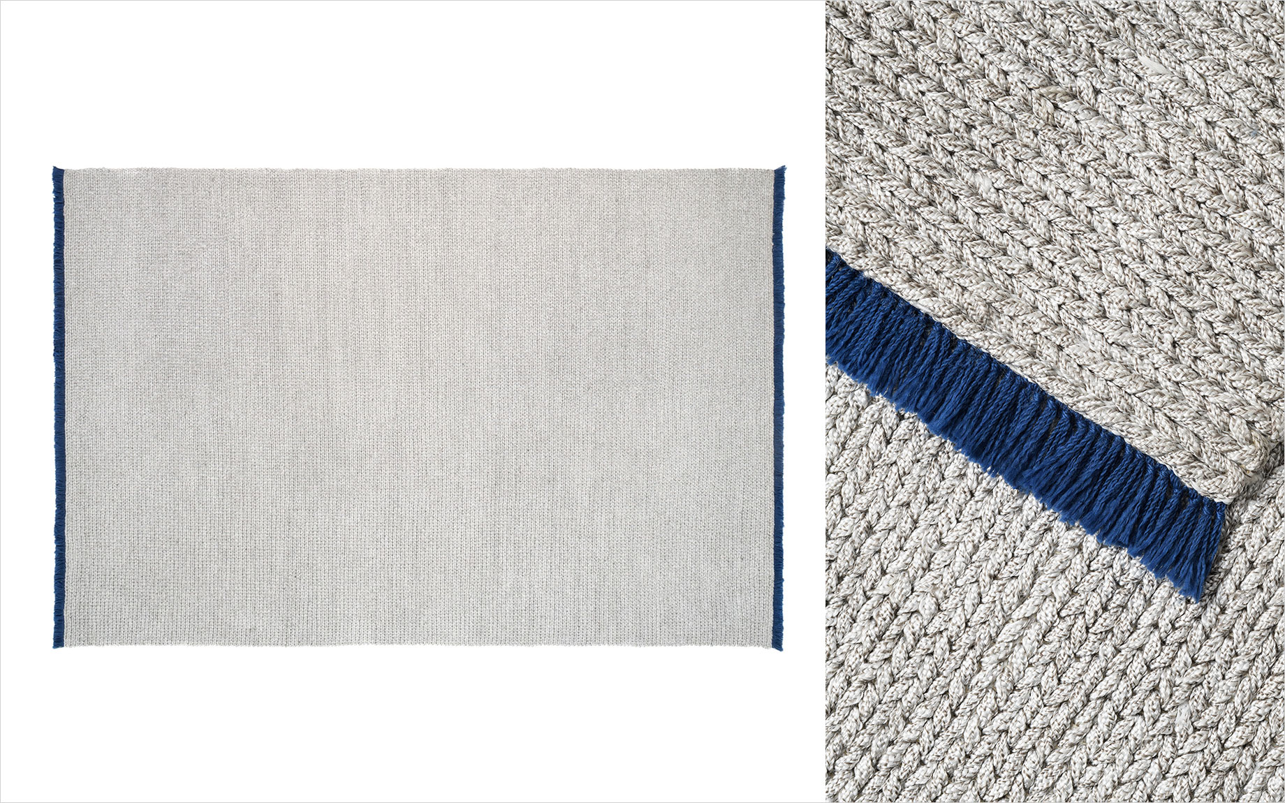 Kウェイトシリーズのラグ「Kリム」。規則正しく織り込まれた厚みのある生地は驚くほど柔らかな肌触りです。屋内はもちろん、外履きでもOKです。ホームユース、コントラクトユースにも居心地の良いリッチな質感を楽しめます。ダークグレーにベージュのフリンジ、ライトグレーにブルーのフリンジという2つのカラーバリエーション、2つのサイズからお選びいただけます。