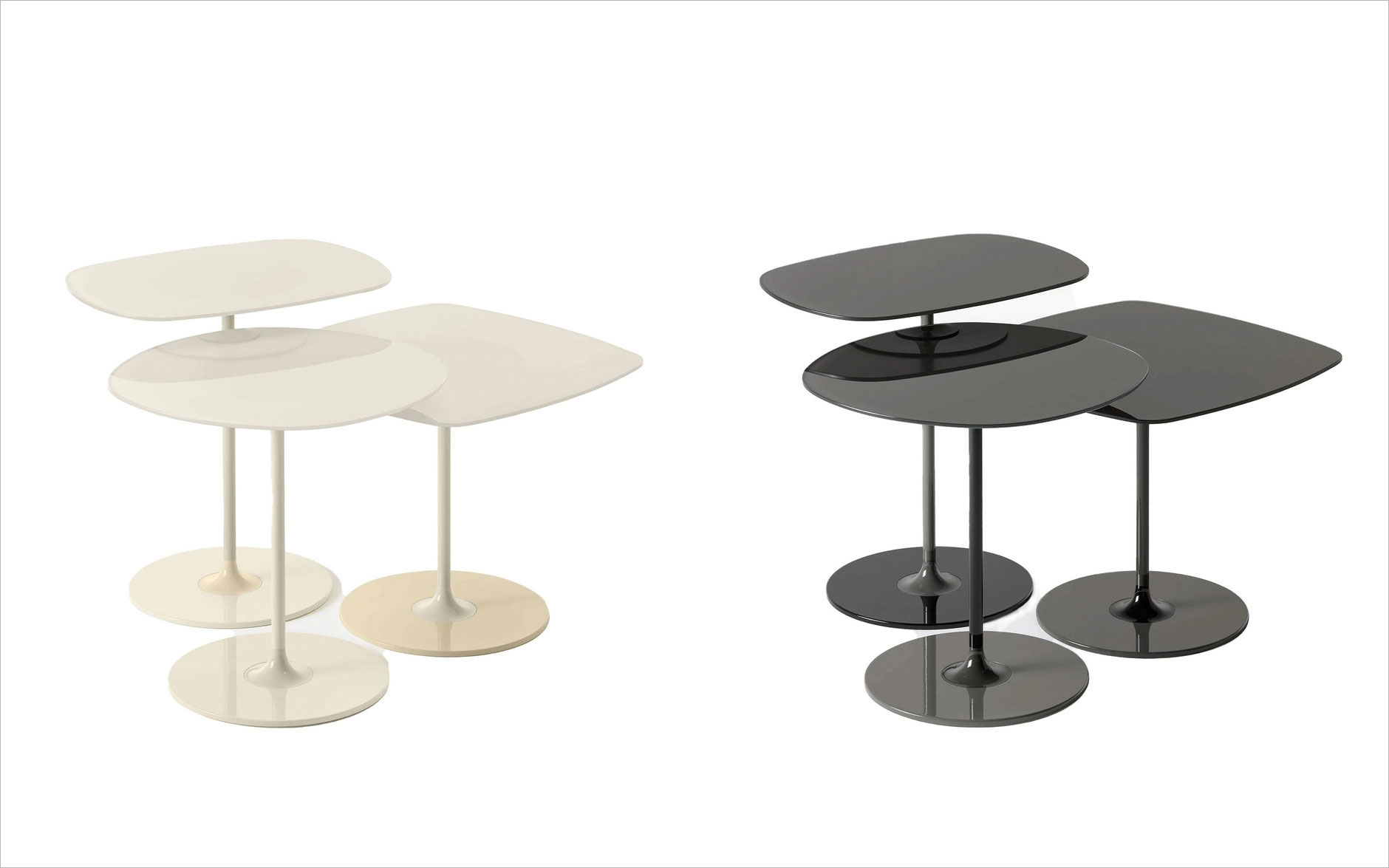 人気のネストタイプのローテーブルにモダンなホワイトとブラックの2色が追加されました。艷やかで光沢のあるガラステーブルとフレーム、ベースは同じ色調の中で対象的な組み合わせになっています。