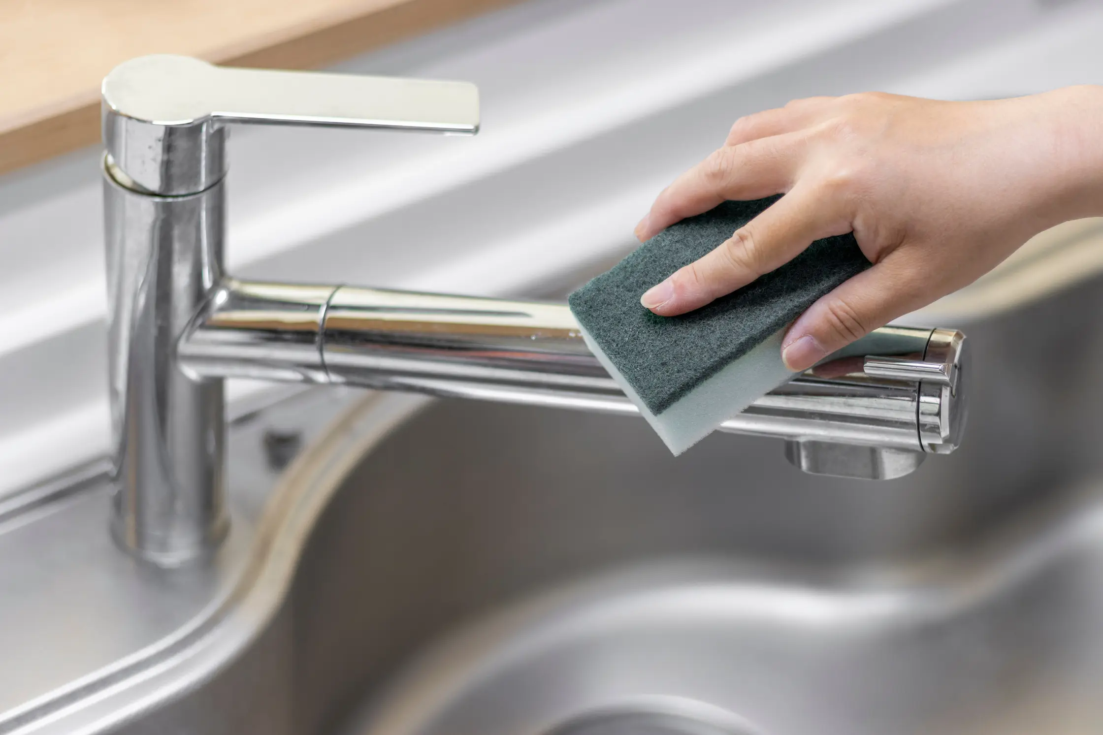 ステンレスキッチンを使用していると、白く手垢汚れが残ることもあります。手垢汚れとは、手で触ったところに、皮膚から分泌される皮脂や汗のタンパク成分、手の角質、手についた細菌やほこりなどが付着することで付く汚れです。手で触ったところに付いた皮脂や汗の水分が蒸発すると、白く跡が残ります。