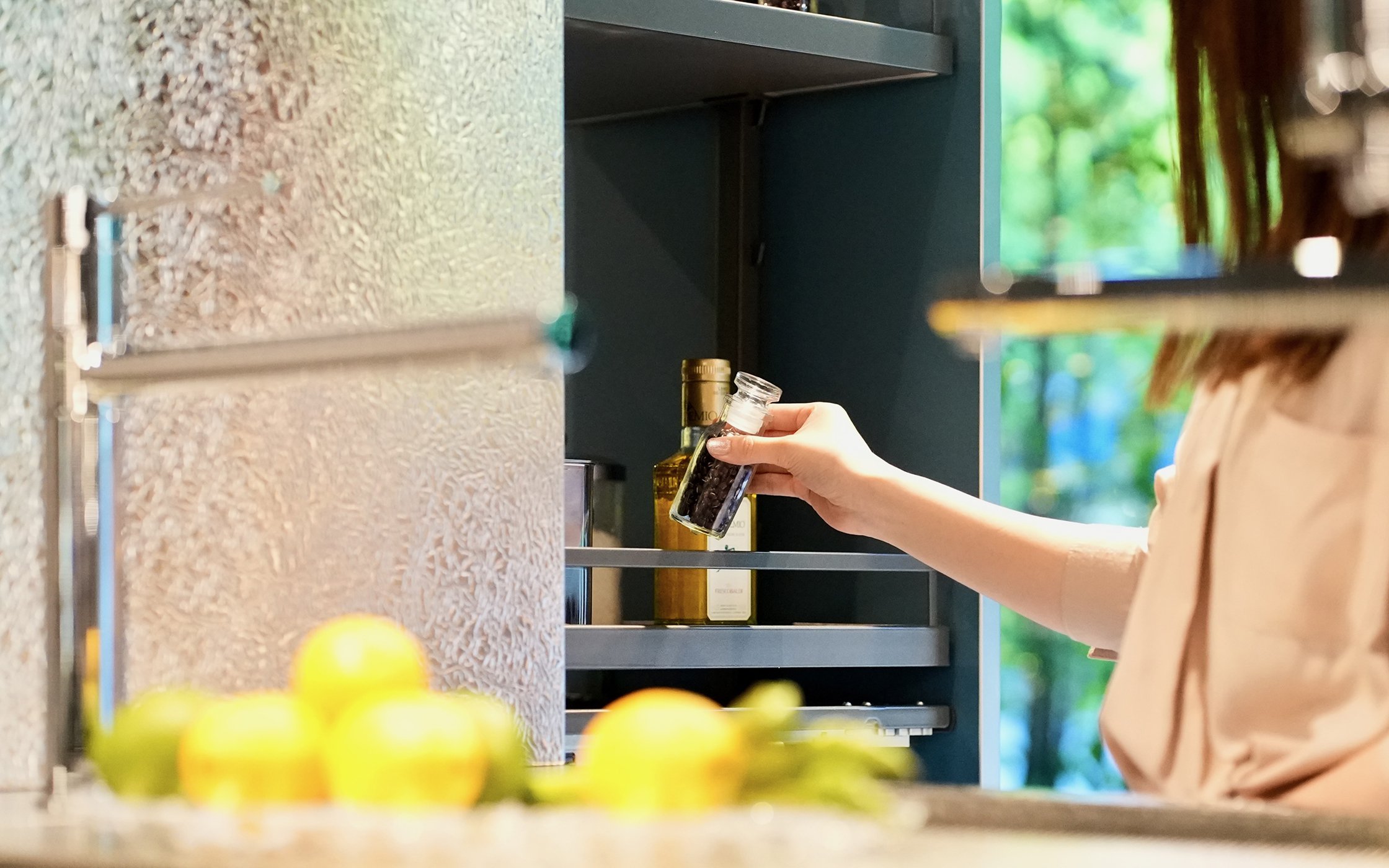 使用頻度をチェックして、よく使う調味料は使いたい時にサッと取り出せるように手の届く高さの場所にしまいましょう。特に頻繁に使うものは手前に置くようにすると出し入れがよりスムーズになります。システムキッチンのグリル横には小さい引き出しが付いているので、小分けにした塩や胡椒、砂糖などを入れると使いやすくなります。