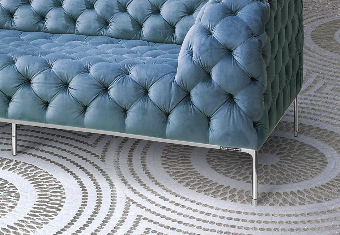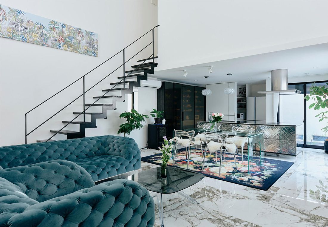 ブルーグレイの集(つどい)ソファと印象的な花柄のmoooiカーペットに色の変化を持たせて、キッチンとインテリアが見事に融合したラグジュアリーな空間になりました。