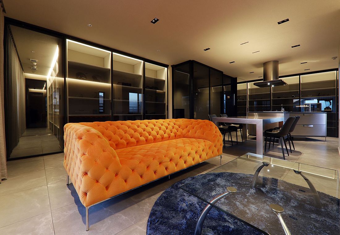 ステンレスのキッチンとテーブルで洗練された空間の中で、オレンジ色の集(つどい)ソファがアクセントになっています。