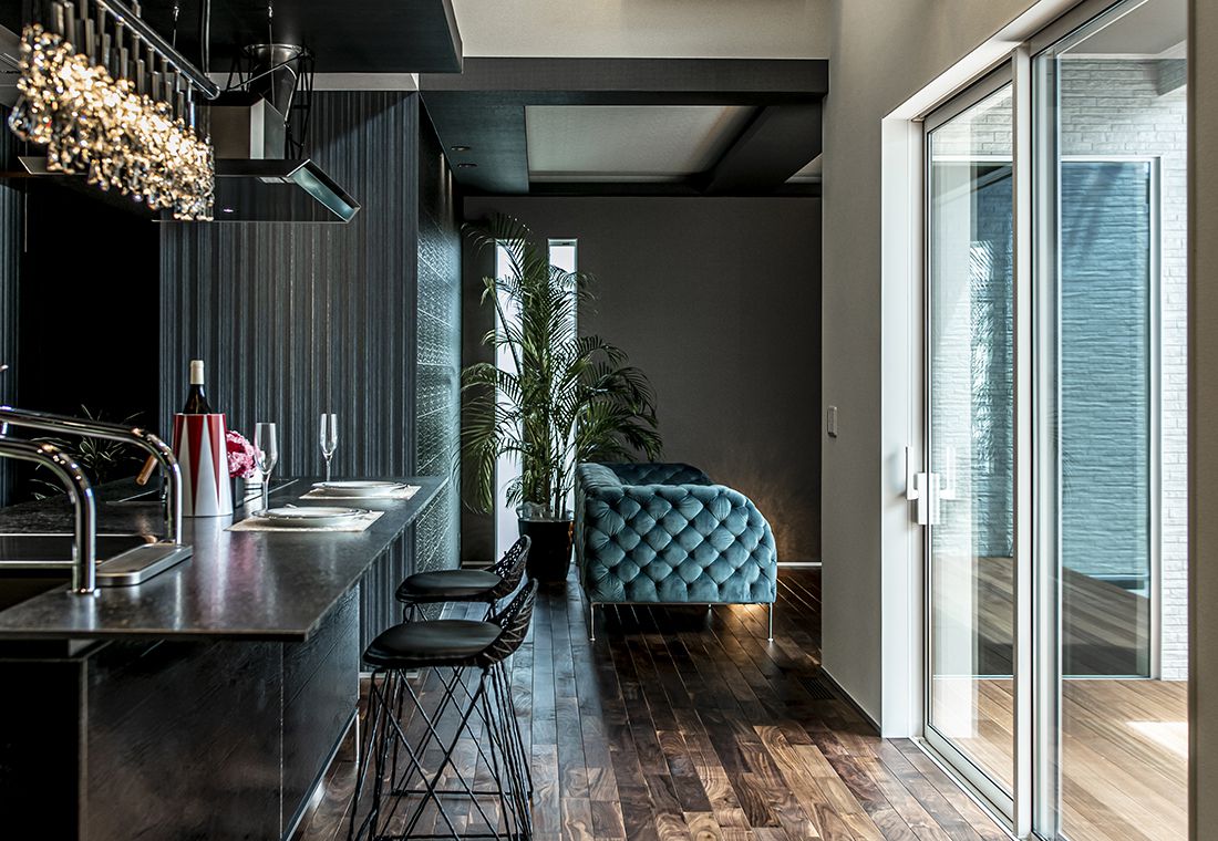 床やキッチンをダーク系でまとめた空間にも集(つどい)ソファのブルーグレイは映えます。