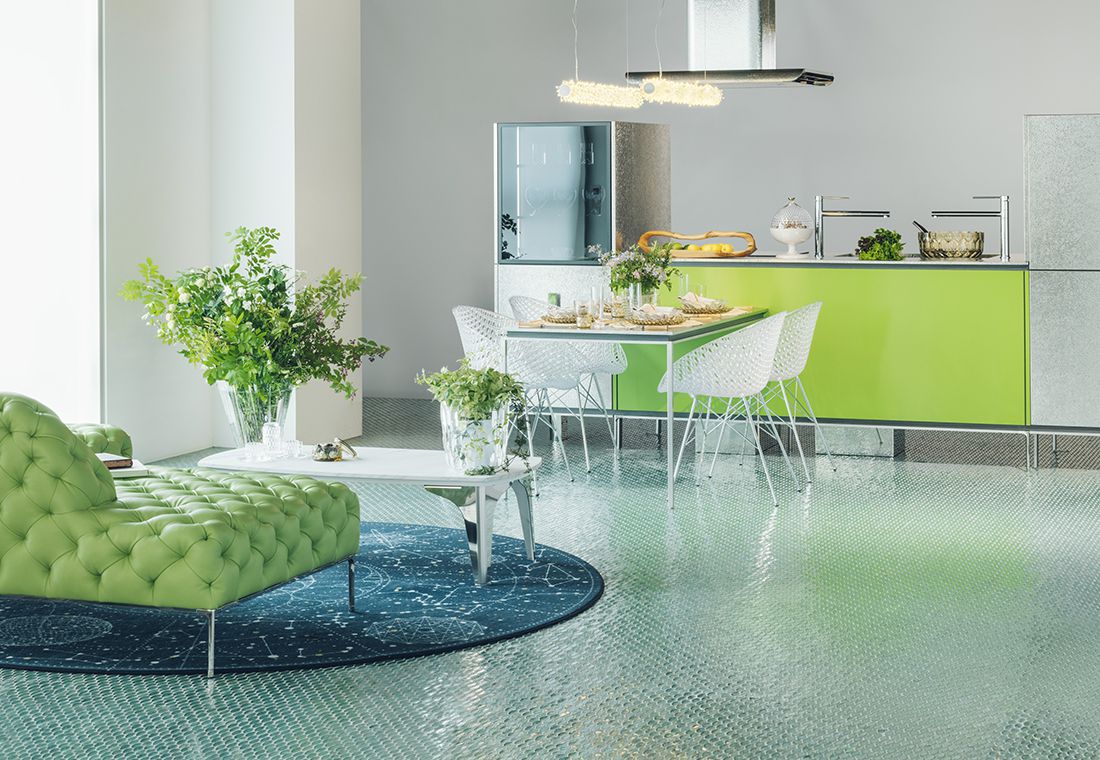 キッチンiNOの扉デザイン、オリガミ2のテーブルトップのデザインを合わせれば、キッチン、テーブル、ソファまで統一感のあるトータルなコーディネートが可能です。