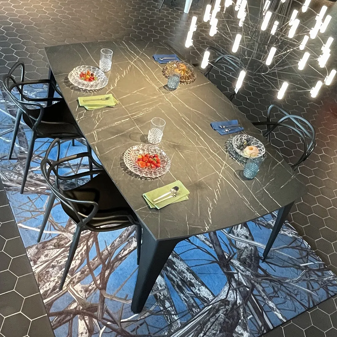 テーブルトップを支えるのは金属製の美しい脚。一枚の紙を折ることでさまざまな姿に形を変え同時に構造的な強度を保つことができるように変化する折り紙をヒントにデザインされています。