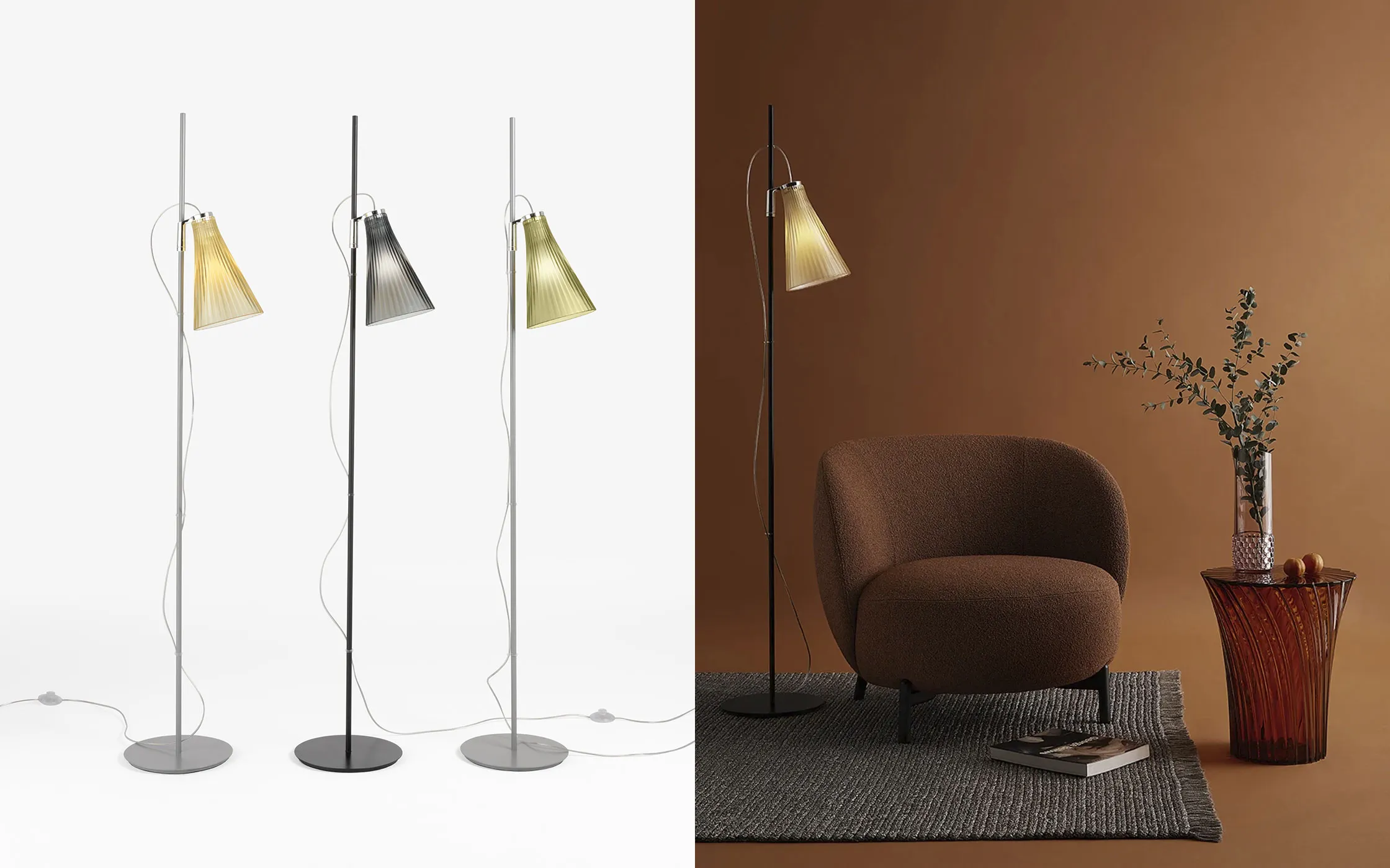 Kラックス|K-LUXフロアランプの特徴は、特殊成形された2層の射出成形プラスチックによる光の屈折の魅力、そして、内側が白、外側がカラーの異なる2色のシェードが特徴です。グレーまたはブラックのスタンドに、スモーク、グリーン、ストローイエローのシェードを組み合わせた全6色のカラーバリエーションがあります。