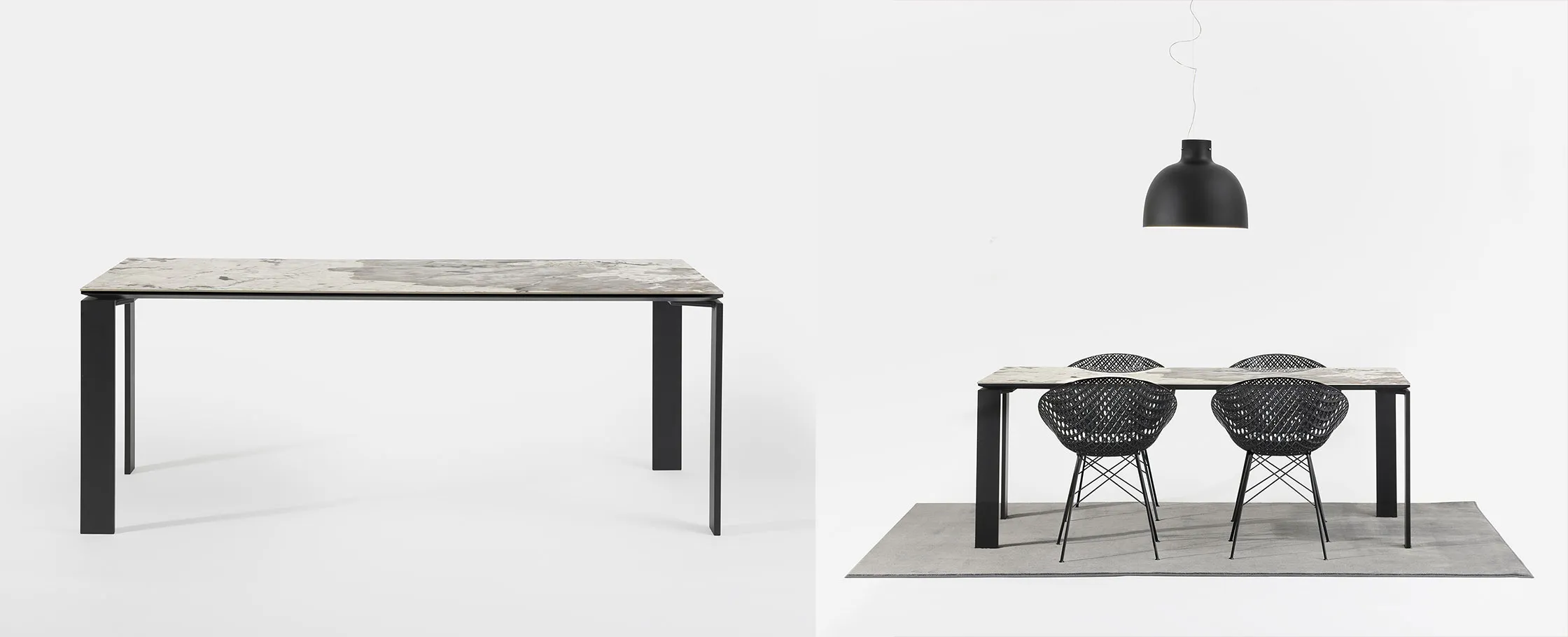 ガラストップは角の取れたスクエア形状、それを支える一本のメタルレッグはシンプルそのものです。美しいカラーを引き立てるシンプルなデザインは、どんなインテリアにも合わせやすく、合わせる椅子も選びません。空間をエレガントでリラックスしたムードに演出します。