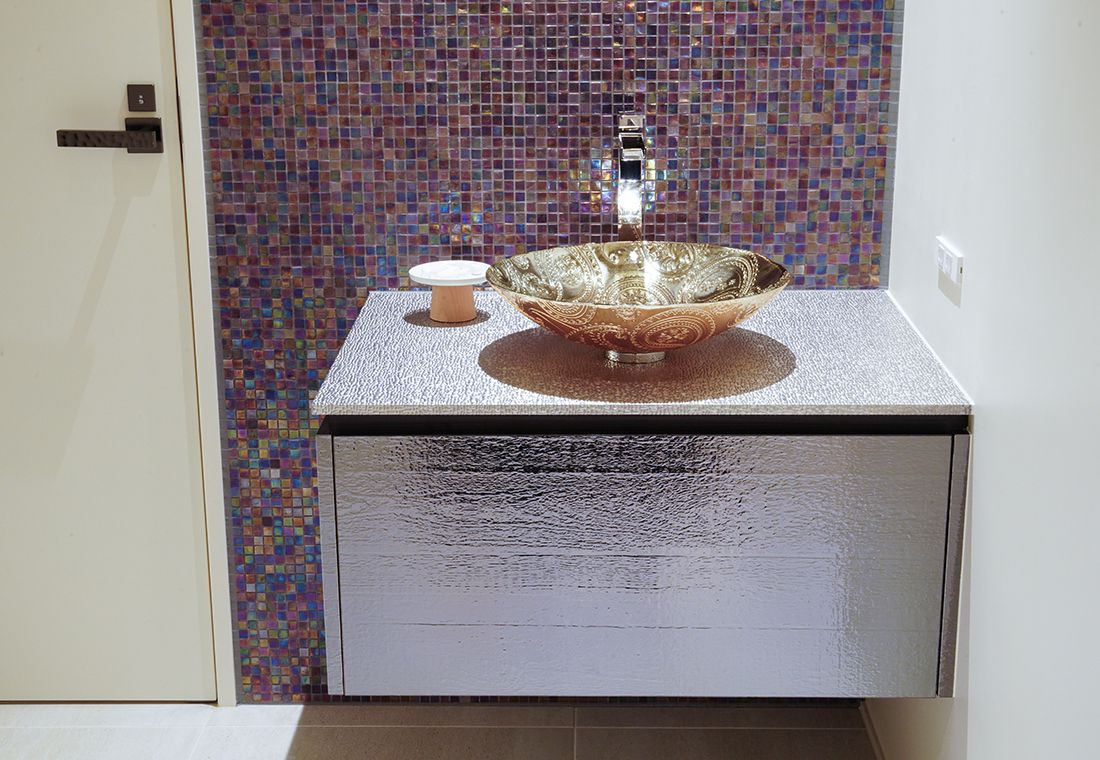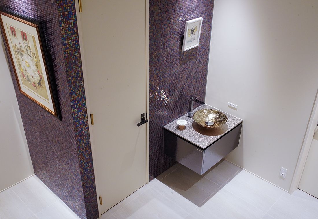 また、LDKと隣接する1階の手洗いコーナーにも、洗面ユニットや洗面ボウル、壁面のベネツィアンモザイクタイルなどにトーヨーキッチンスタイルの製品が採用されました。