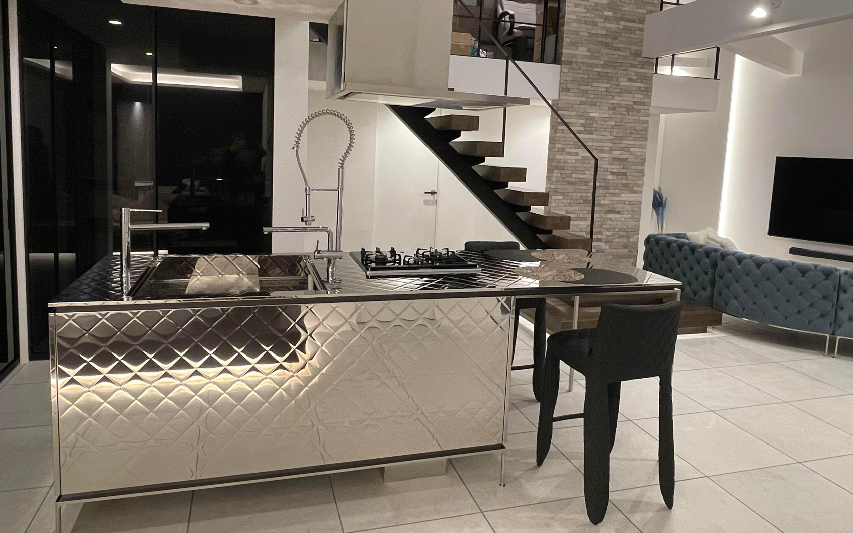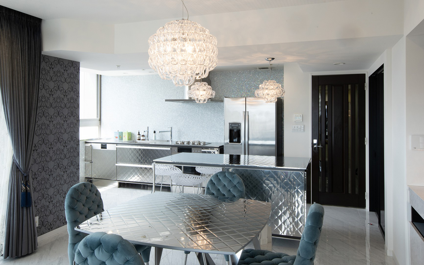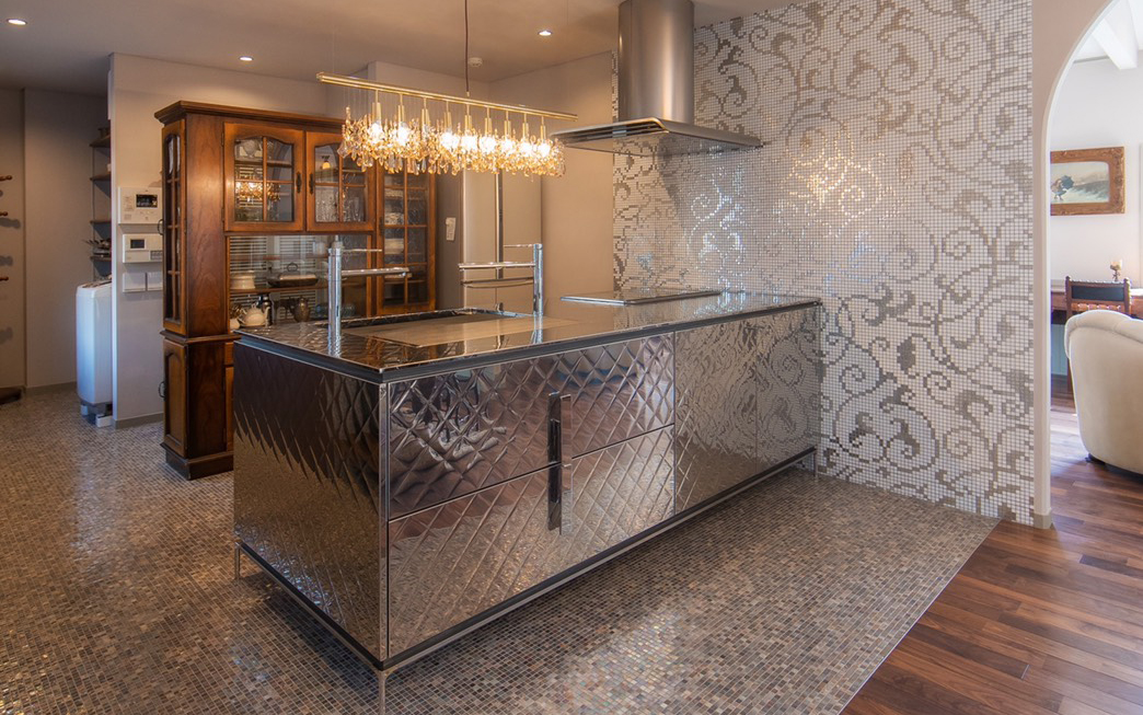 固いステンレスをミシンで縫ったようなキルティングは特殊なプレス技術で、ダイヤパターンの幾何学模様を描き、表面を鏡面仕上げすることで柔らかさを演出し、鏡のように美しく周囲を映し出します。