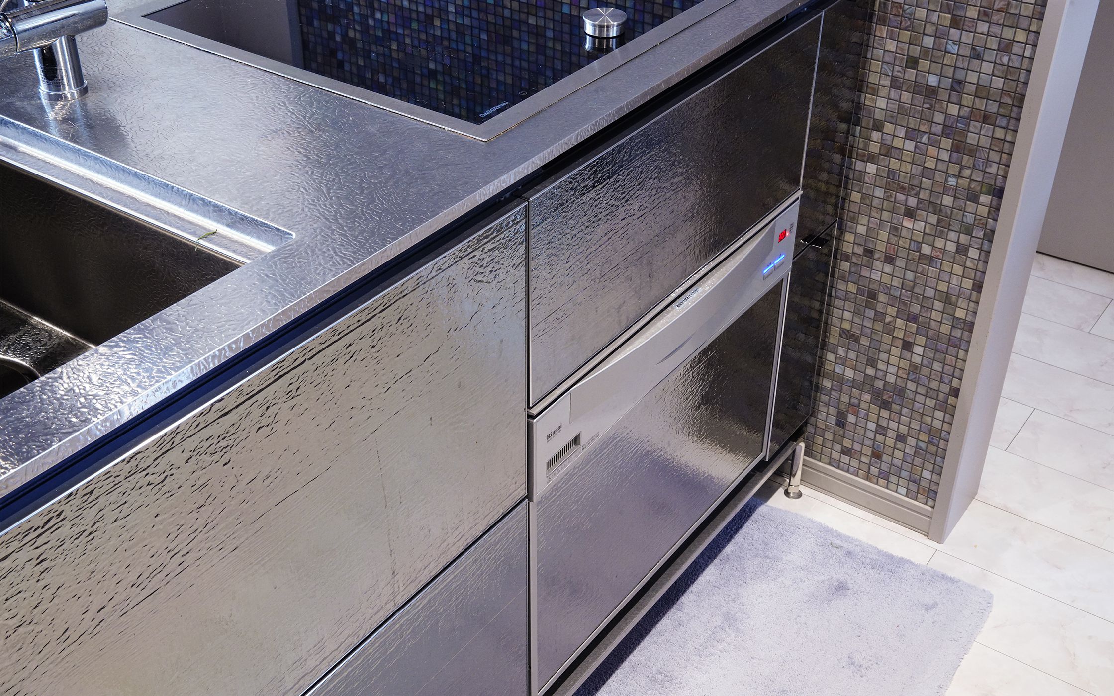 左:品のある煌びやかさが魅力のメタルスモークの扉材。